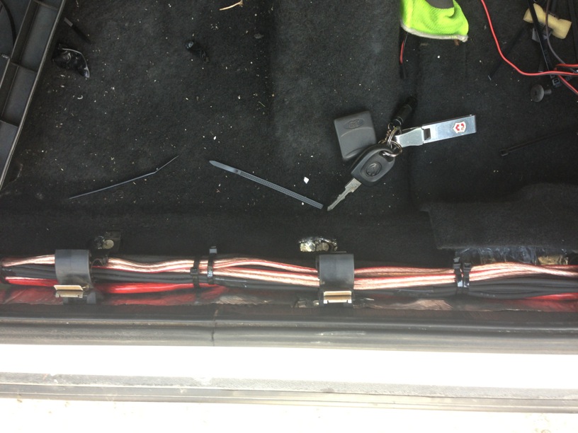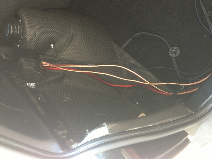 Всичко досега беше посветено на една основна цел - шумоизолиране от външен шум и елиминиране на вибрациите от музиката вътре в купето. Термоизолацията е страничен положителен ефект. Преокабелихме голфа с висококачествен кабел - 4 квадрата. Рано или късно тонколоните ще започнат да ми идват слаби, а с 4 квадрата мога да включа ... меко казано мощни тонколони. От стария собственик наследих страхотен захранващ кабел към крайното стъпало в багажника, който тежи сигурно два килограма. Уникален. Следват снимки на окабеляването: