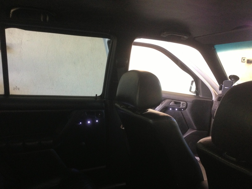 Преди много време бях видял един колега, който беше набил светодиоди във вратите, за да му осветяват земята - предпазва от стъпване в локви, препъване в прагове и прочие. Доразвихме идеята на колегата и така разположихме светодиодното осветление, че да осветява и вътрешността на колата при затворени врати. Много удобно и работи. Да не говорим колко красиво изглежда нощно време, а и обозначава отворена врата нощно време за разни минаващи автомобили: