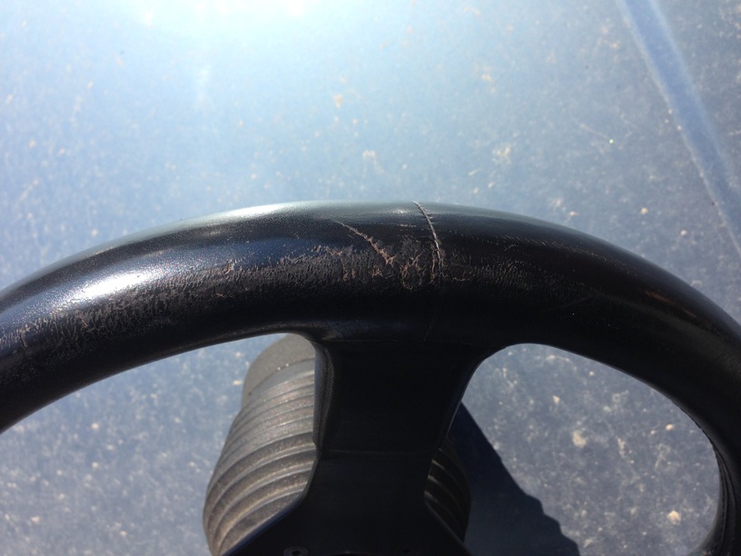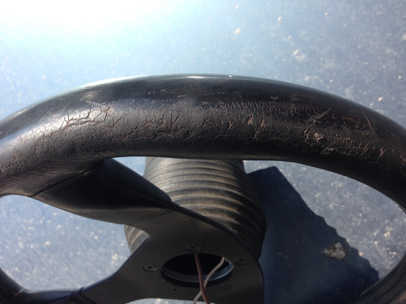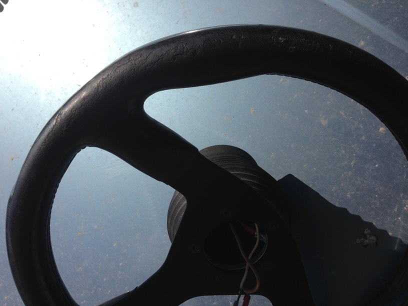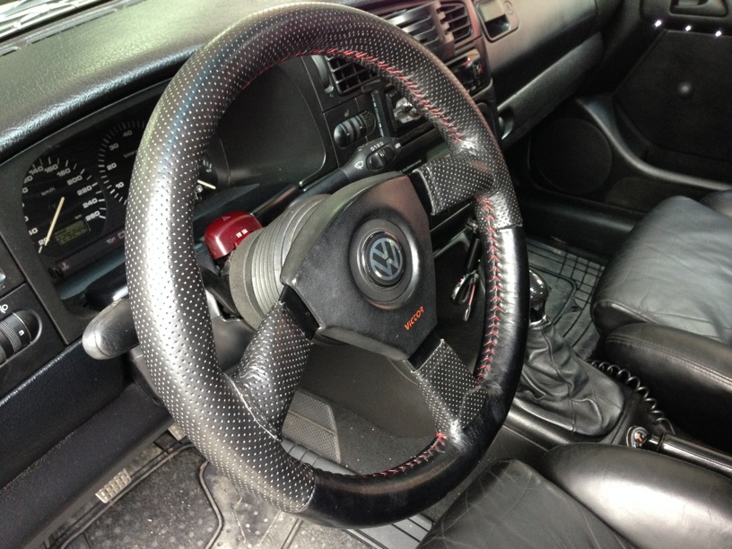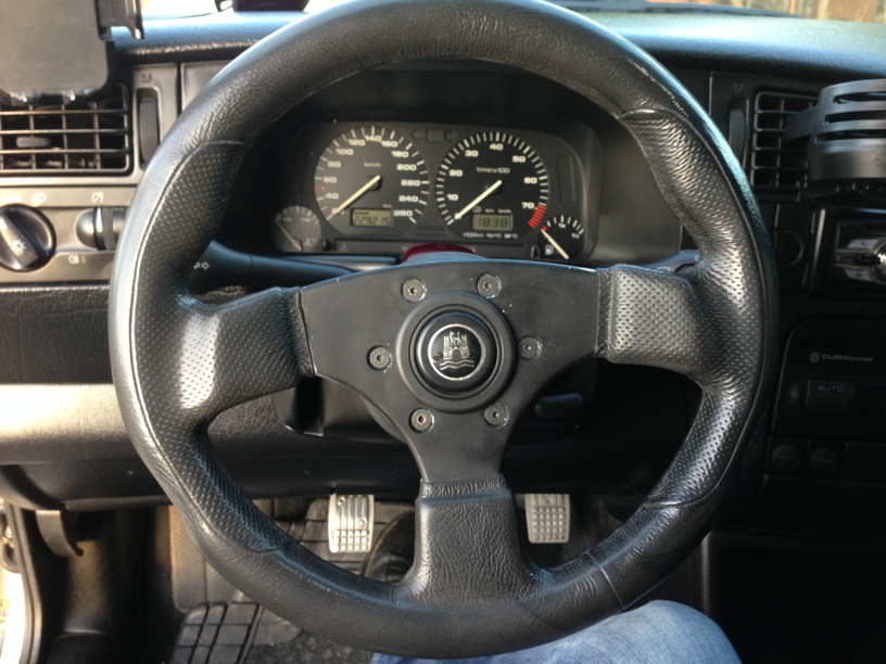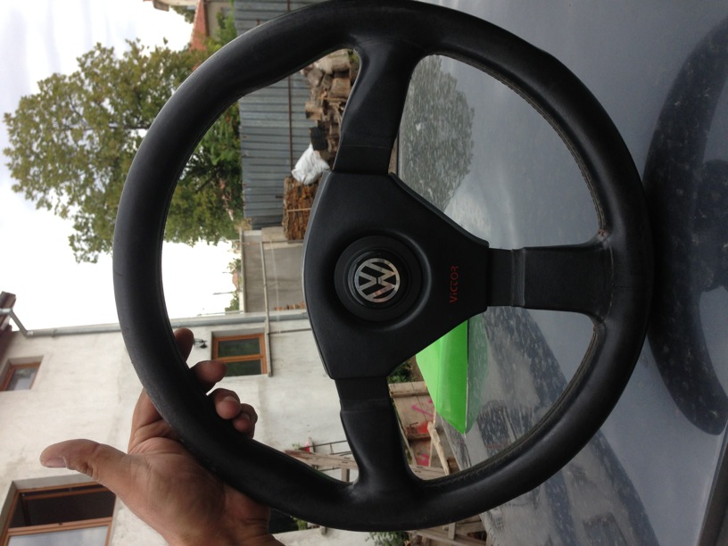Синхронизирах новоосъзнатата си зрялост с ето този голям геврек на Victor, за който легендата твърди, че е оригинален спортен волан на VW Golf 3. Състоянието на волана беше плачевно: