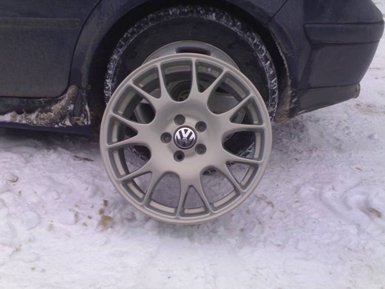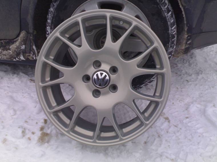 Днес най-после си взех джантите от бояджията.Имат леки забележки,но те са в следствие на моята обработка преди боята за жалост.Купих и два комплекта капачки-едните с логото на VW,другите универсални,че оригиналните са на Ауди и не мога да ги ползвам.Взех и комплект метални вентили и поръчах стикери за универсалните капачки,които ще са при мен в понеделник.