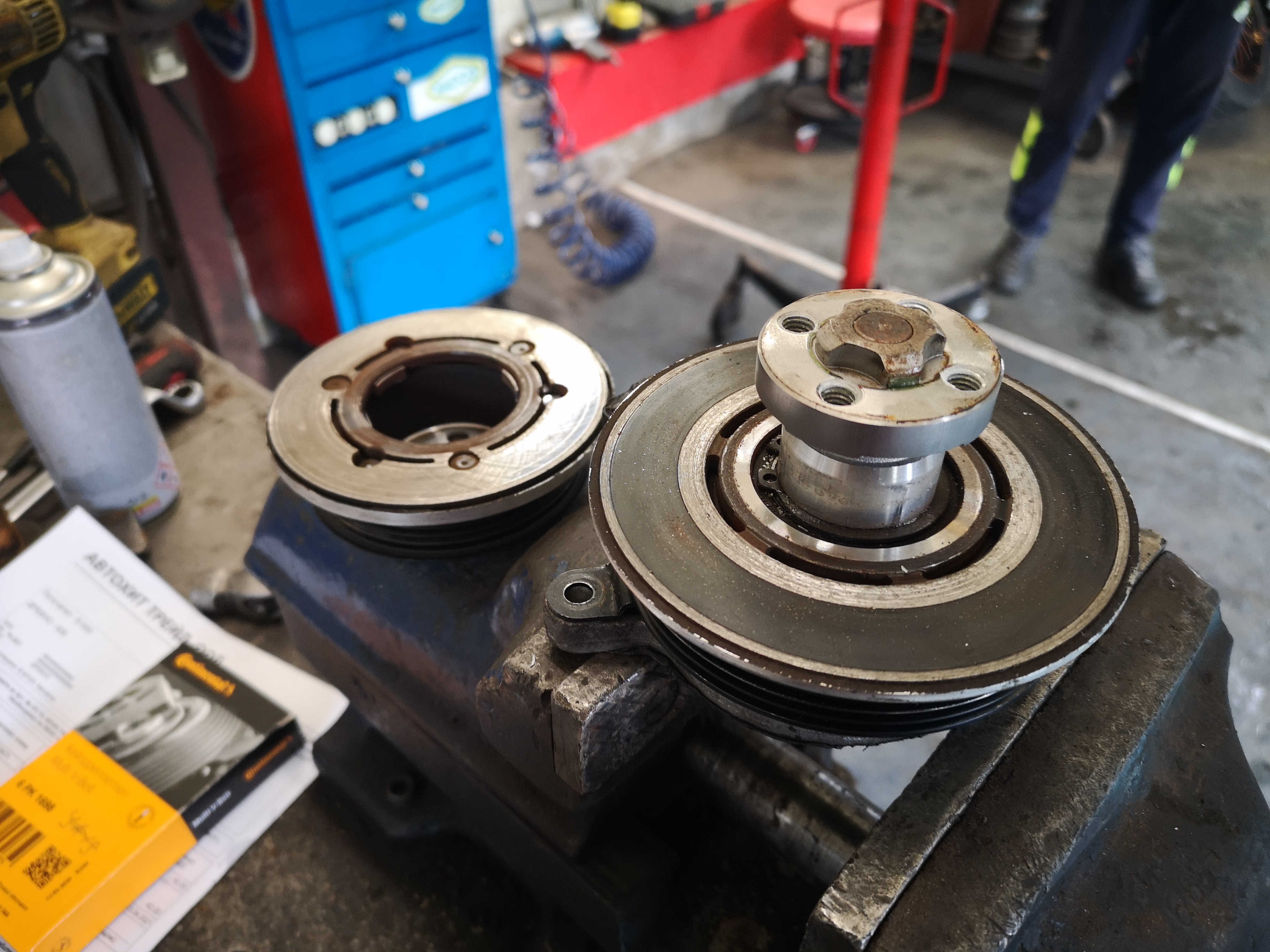 Оправих си проблемите вече, 470 лв. помпата + 140 радиатора, колата с какъв радиатор съм я взел ако знаете... Ужас. Давам снимки на старата помпа, разглобихме я и видяхме къде е почнала да стърже съединителя й, в най-вътрешната й част, че сега вече нищо не се чува при газ и спирачка. Също и снимка на новия радиатор, нормалния