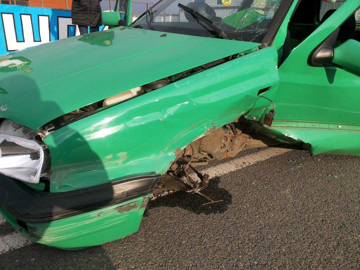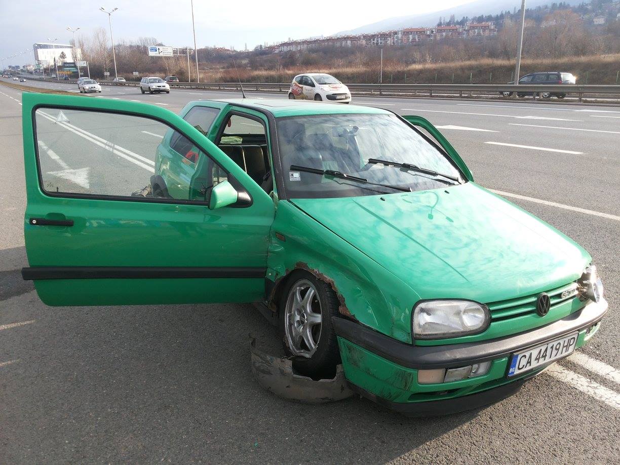 Предното ляво колело се откъсна с амортисьора при страничен удар с мантинелата след като една сива астра ме изблъска отдясно. Но пак най-важното е, че няма пострадали и всички са добре!