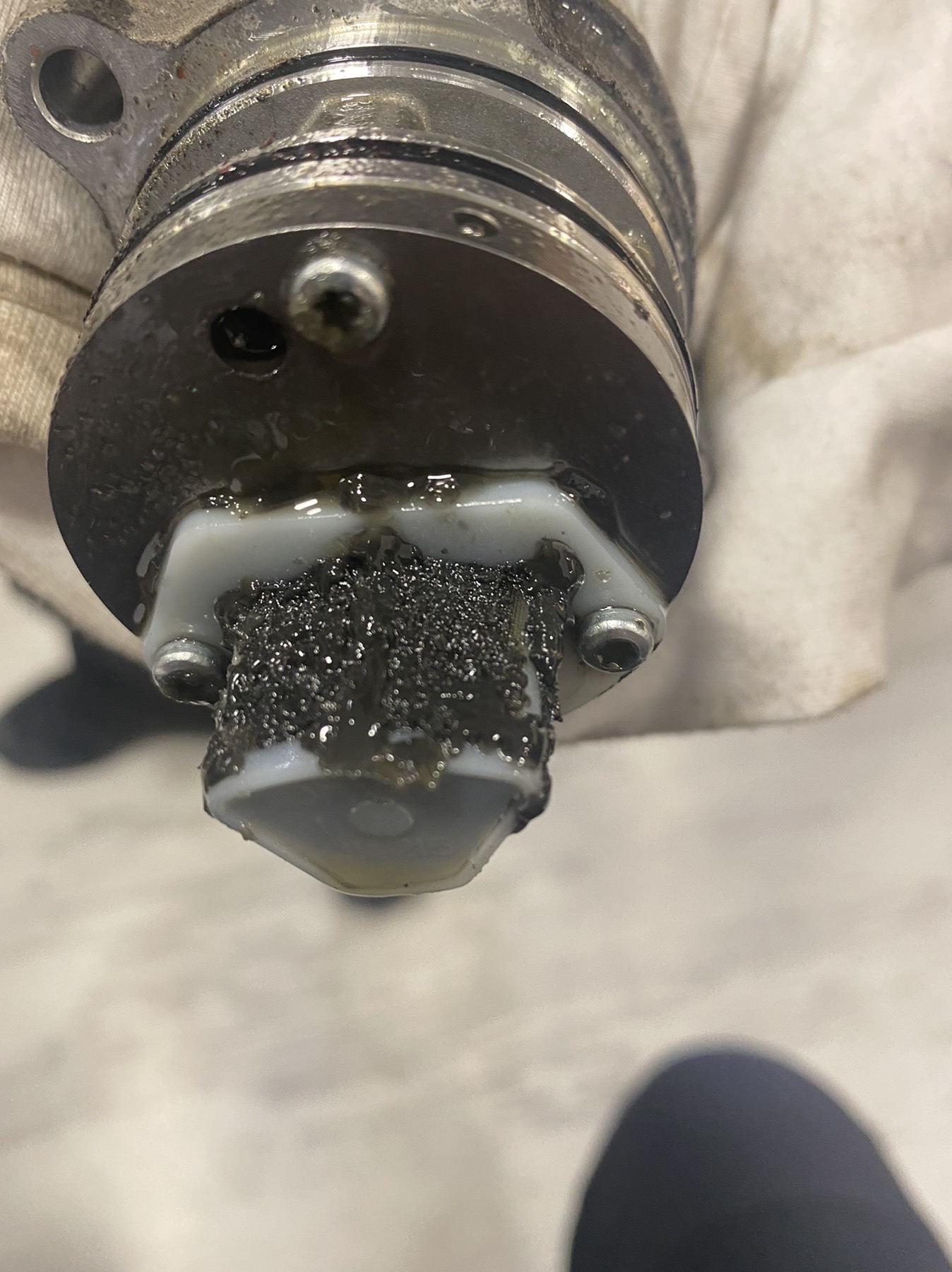 Интересното за Haldex-a е, че маслото е сменяно преди това само веднъж на третата година (както е по предписание), когато колата е била на 86 000 км. Две години и 50 000 км по-късно цедката беше доста задръстена. Вероятно при предишната смяна на маслото цедката не е била чистена - не знам. Нужно е да се разглоби и да се почисти цедката, което оскъпява малко, защото изисква допълнителен ремонтен комплект болтове (общо 240 лв беше смяната), но на фона на потенциалните проблеми с Haldex-a е препоръчително да се извърши по този начин. Ето и снимка:
