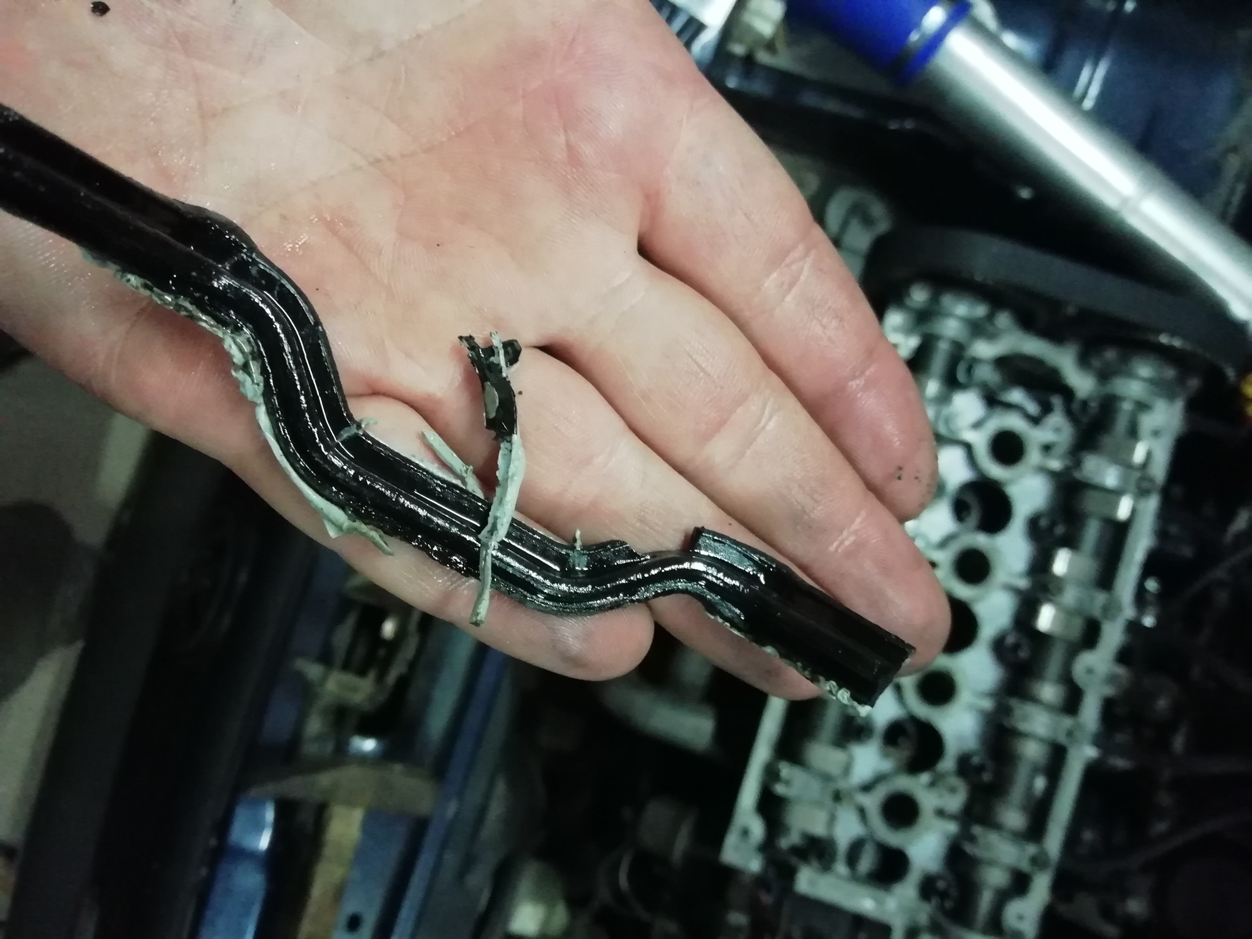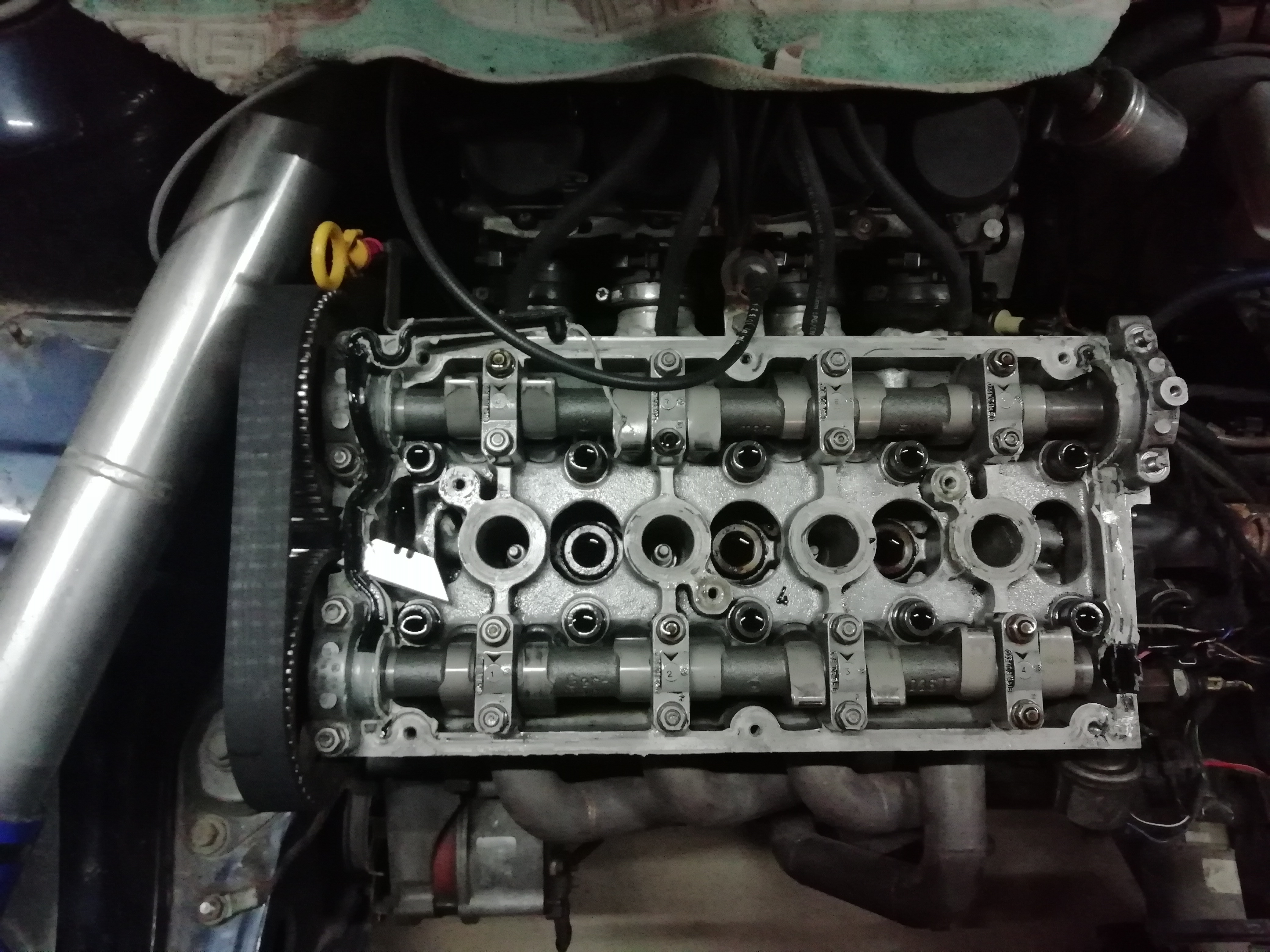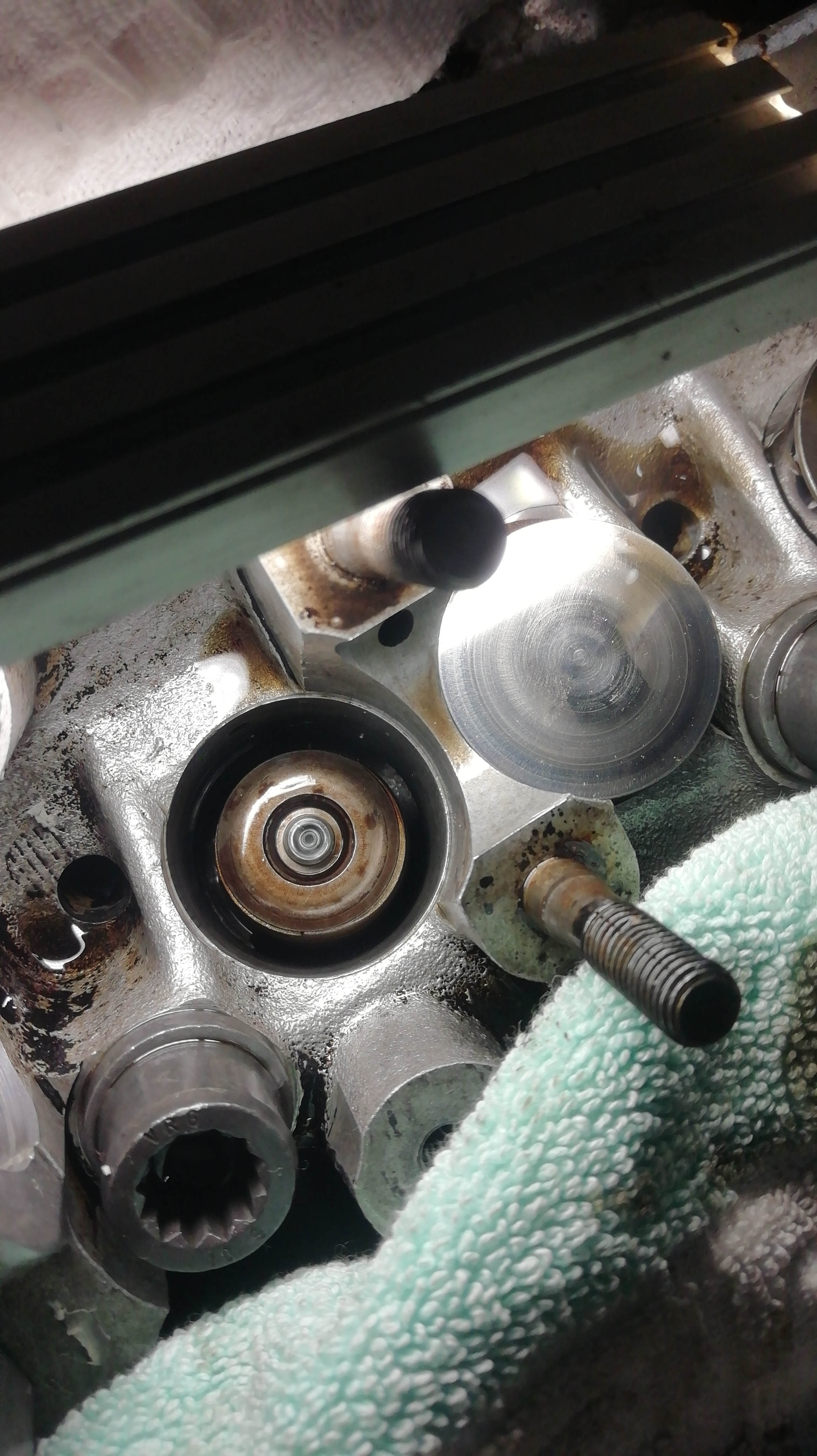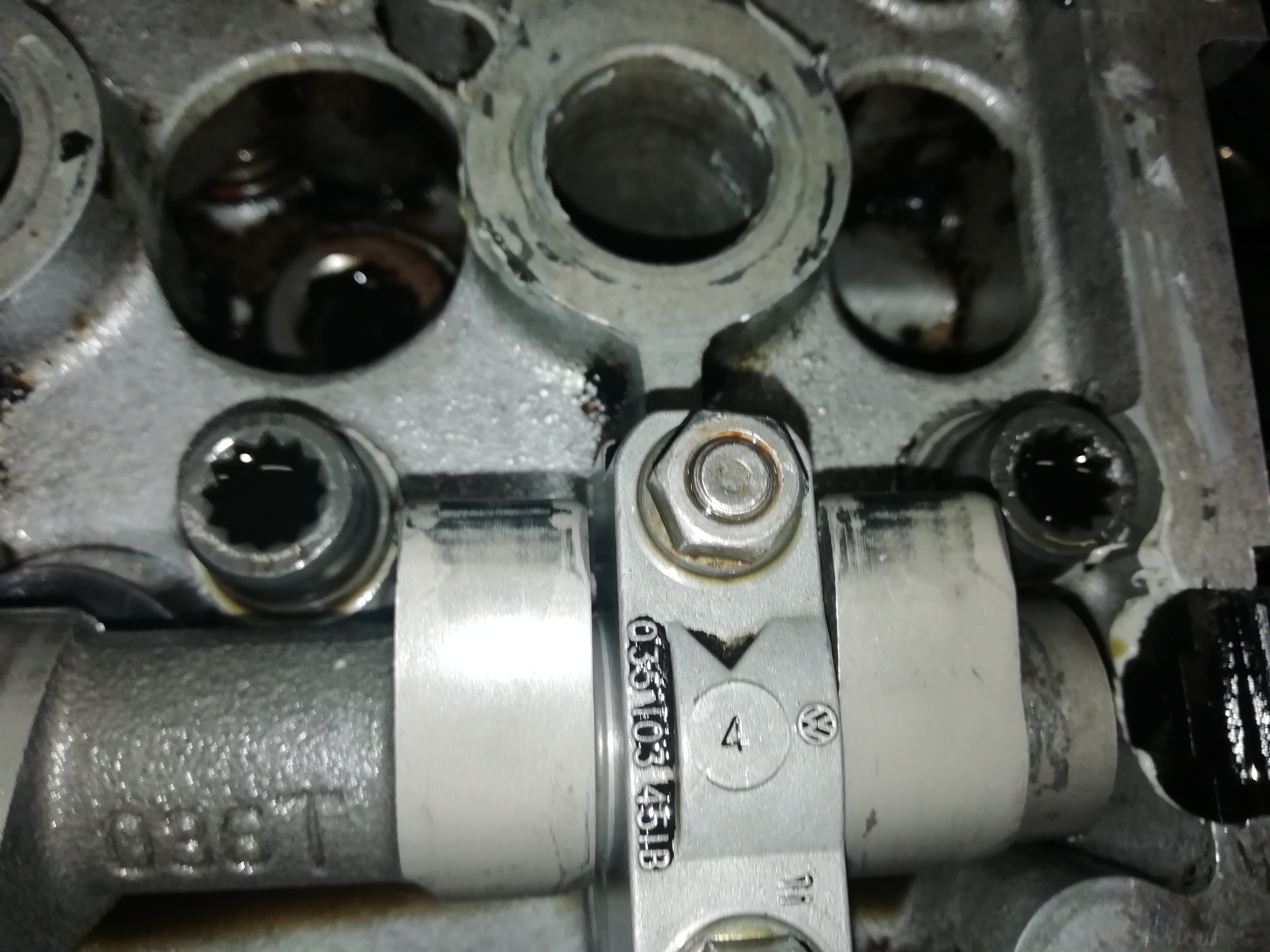 При махането на капака за клапаните половината от уплътнението остана на главата - беше се изпекло на бакелит. Добре че VW са правили делимо уплътнение през една от годините на тоя мотор, та си поръчах такова и след много чоплене успях да изстържа старото от канала.