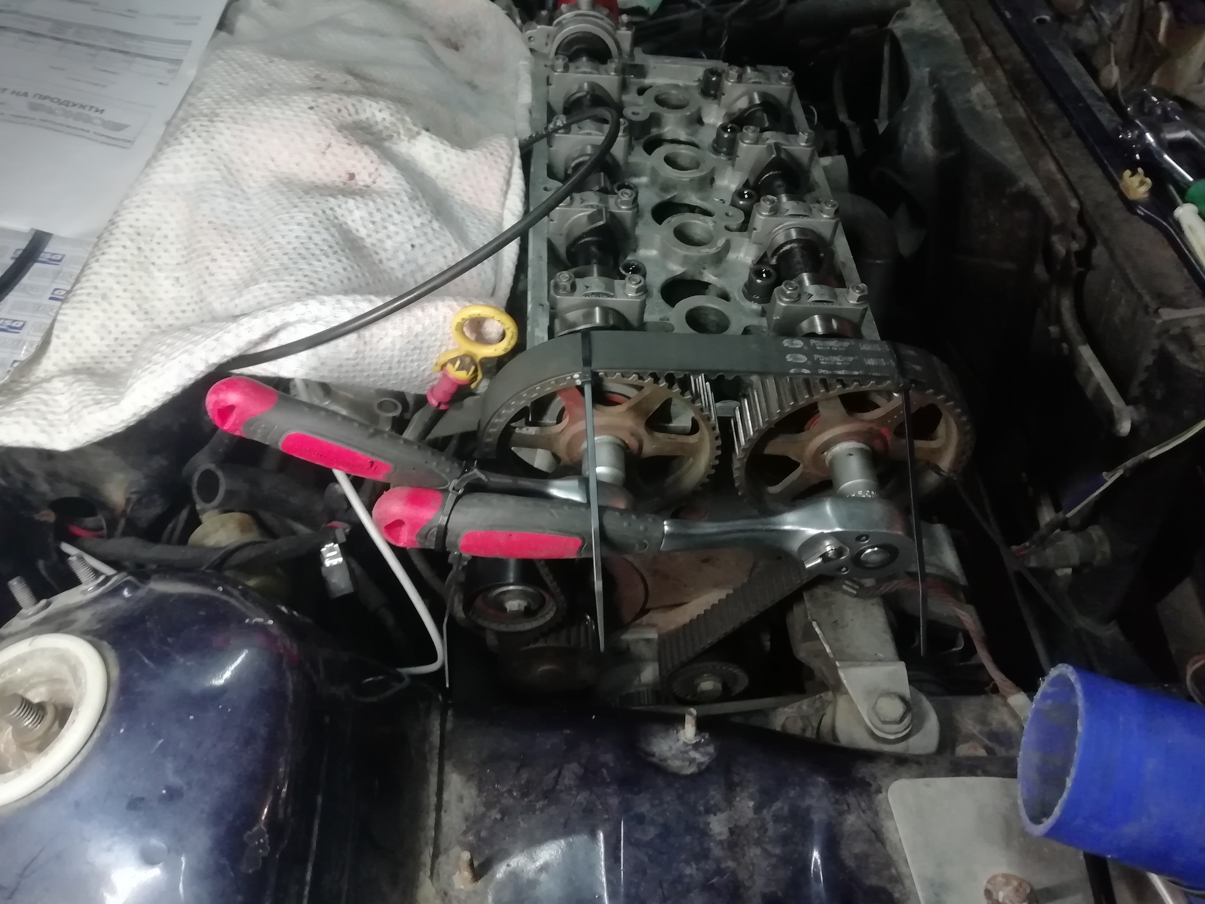 Ремъка взе да ми опъва нервите и бях на ръба да срежа свиняците на зъбните колела на разпределителните валове, но свалих обтяжната ролка и се оправих. Оправянето включваше две тресчотки - една на затягане, другата на отвиване, за да коменсирам един корем който ремъка правеше между двата разпределителни вала. И понеже нямах трета ръка - свиняк ме спаси.