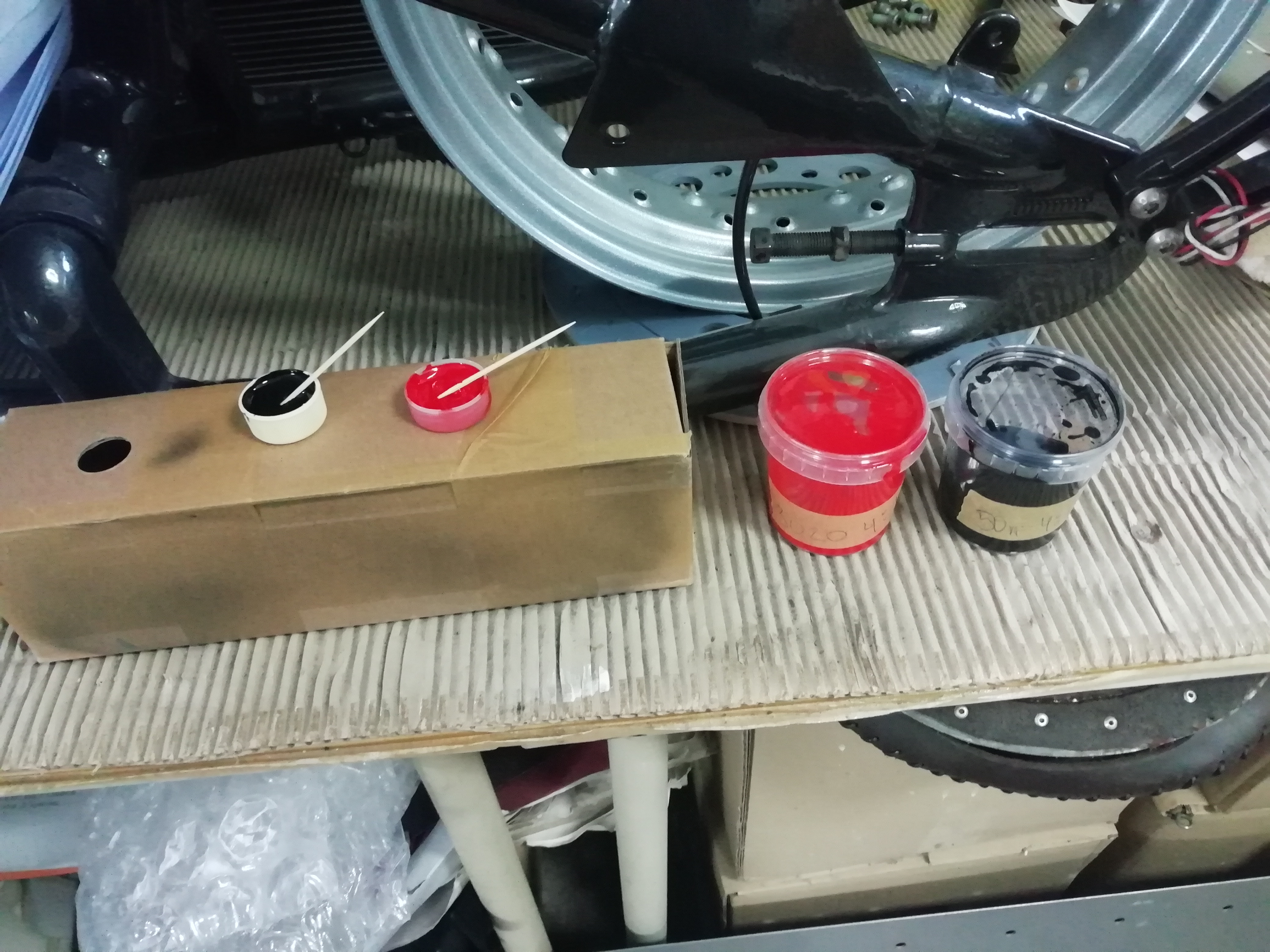 Купих полиуретанова боя в червено и черно, за да се налеят надписите на капака. Днес би трябвало да е готов и да го взема, след което ще търся човека дето го полира за да го свежне и да нанесем керамика отгоре.