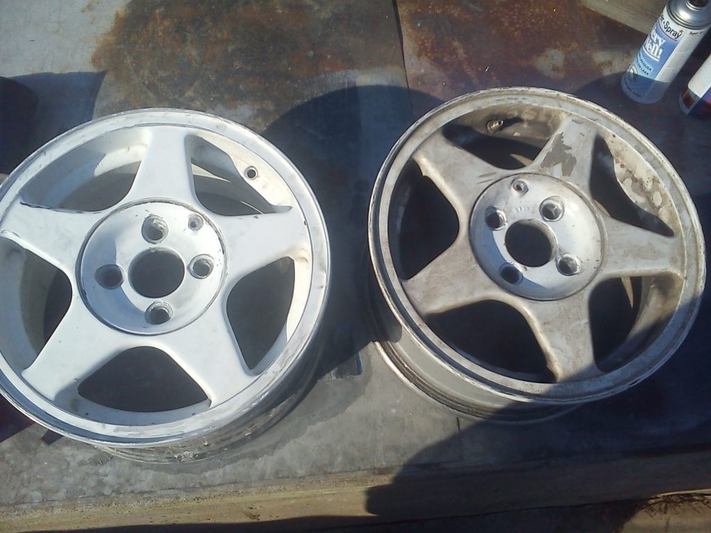 Ето разликата след голямото шкурене ,на някои от джантите се наложи да се шкури до алумин.Боята има беше много дебела и на доста места разтекла затова се поиспотих със шкуренето.