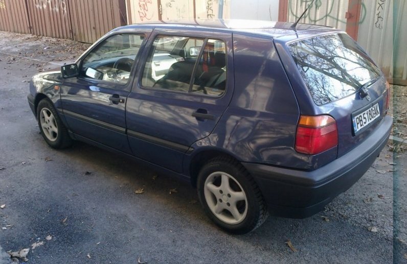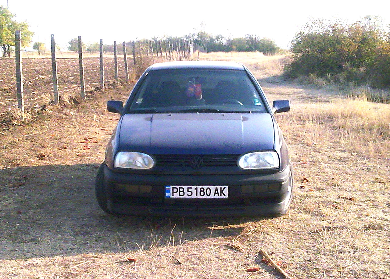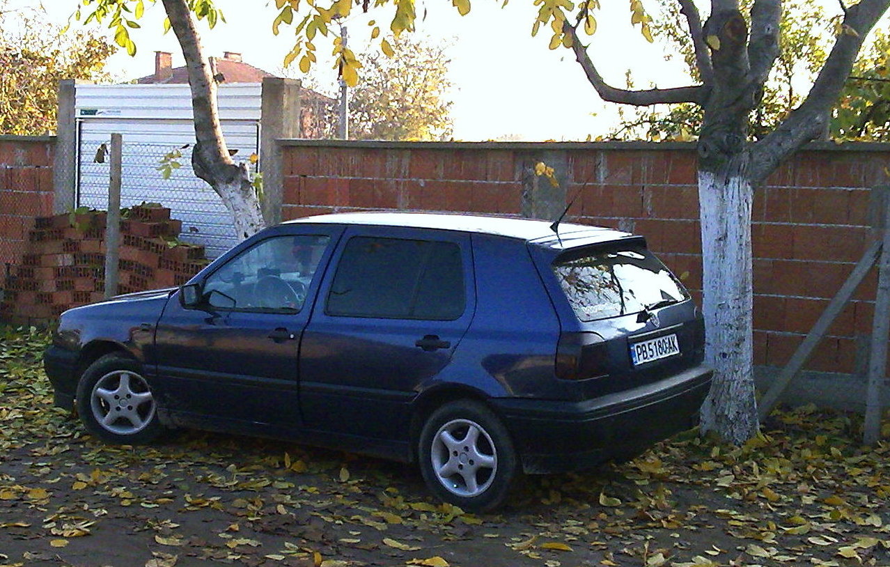 Здравейте колеги!Нека и аз да ви представя моят VW.А именно голф 3 1.6 75 кс произведен 1994 година,а първата и регистрация е през 1995.Като екстри колата има:климатик,лети джанти,аларма,имобилайзер,централно заключване и ел. стъкла.Автомобила го имам от 1 година.В последствие направих някои подобрения по външния вид на колата:Широк нож,споилер на 5-та врата,преминаване от едносекцйонни към двусекцйонни фарове,затъмняване на мигачи и бленди с трансперантно фолио,стопове Hella magic colours blue- който още не са сложени на колата,затъмняване на стъклата,купих си и решетки за предната броня.Ето снимки на колата,така изглеждаше когато я взех