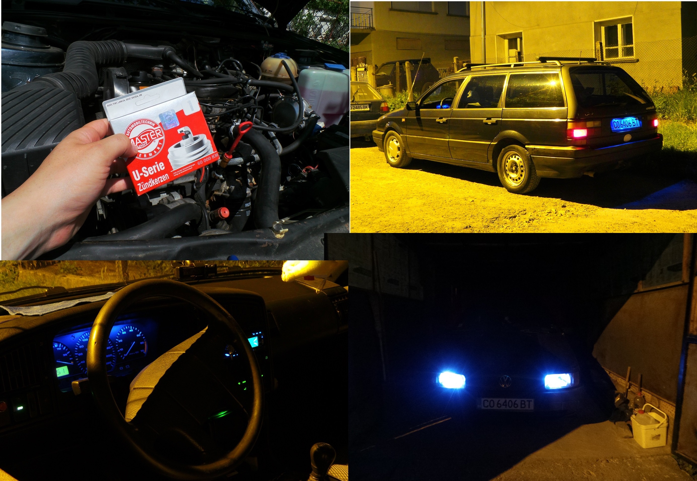 Следващите стъпки бяха нови свещи (оказа се, че бако си е правил яко гаргари с Пасата.. две от свещите бяха с един електрод, а другите две с три...), LED крушки на габаритните светлини, номера и километража.