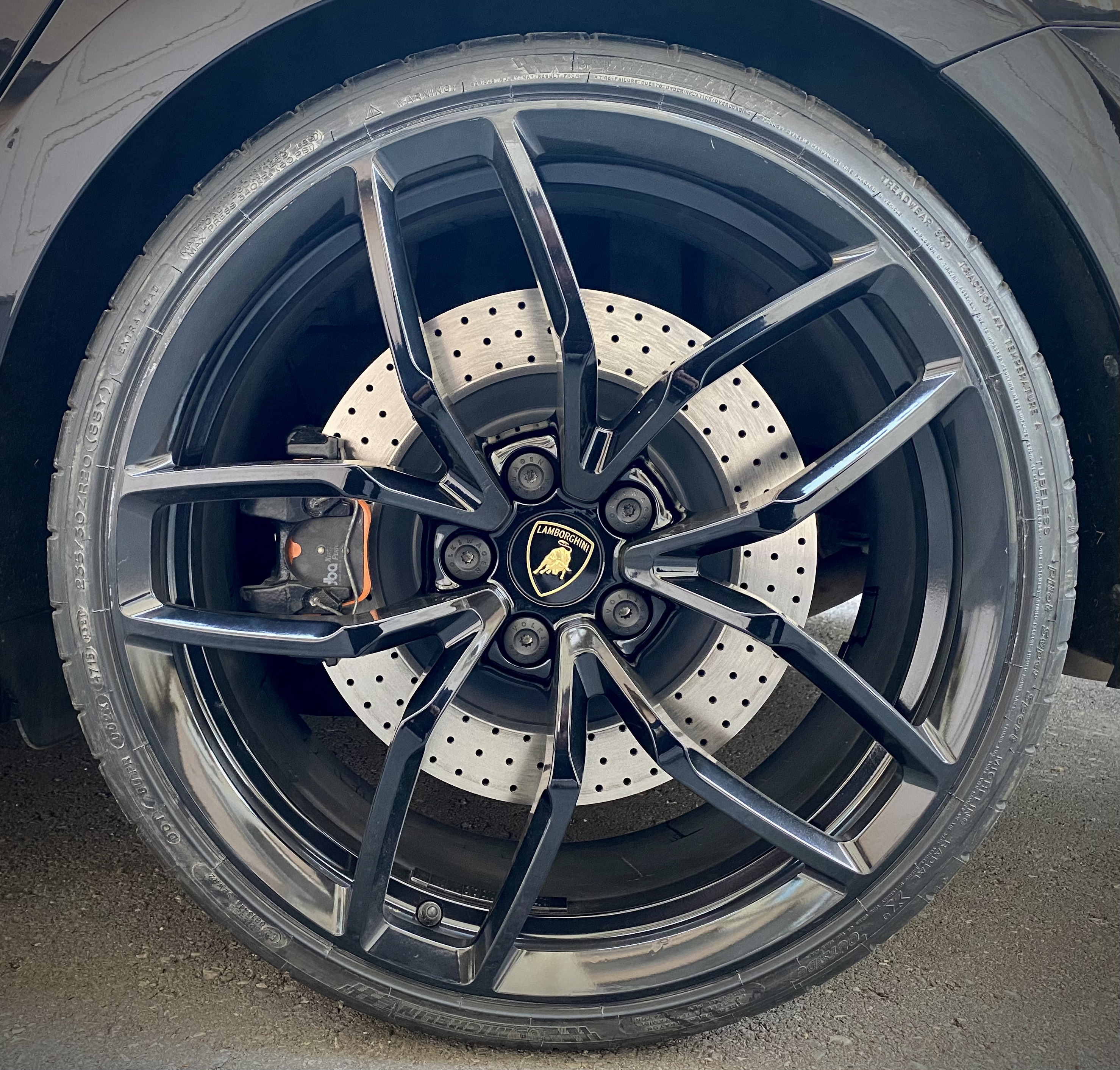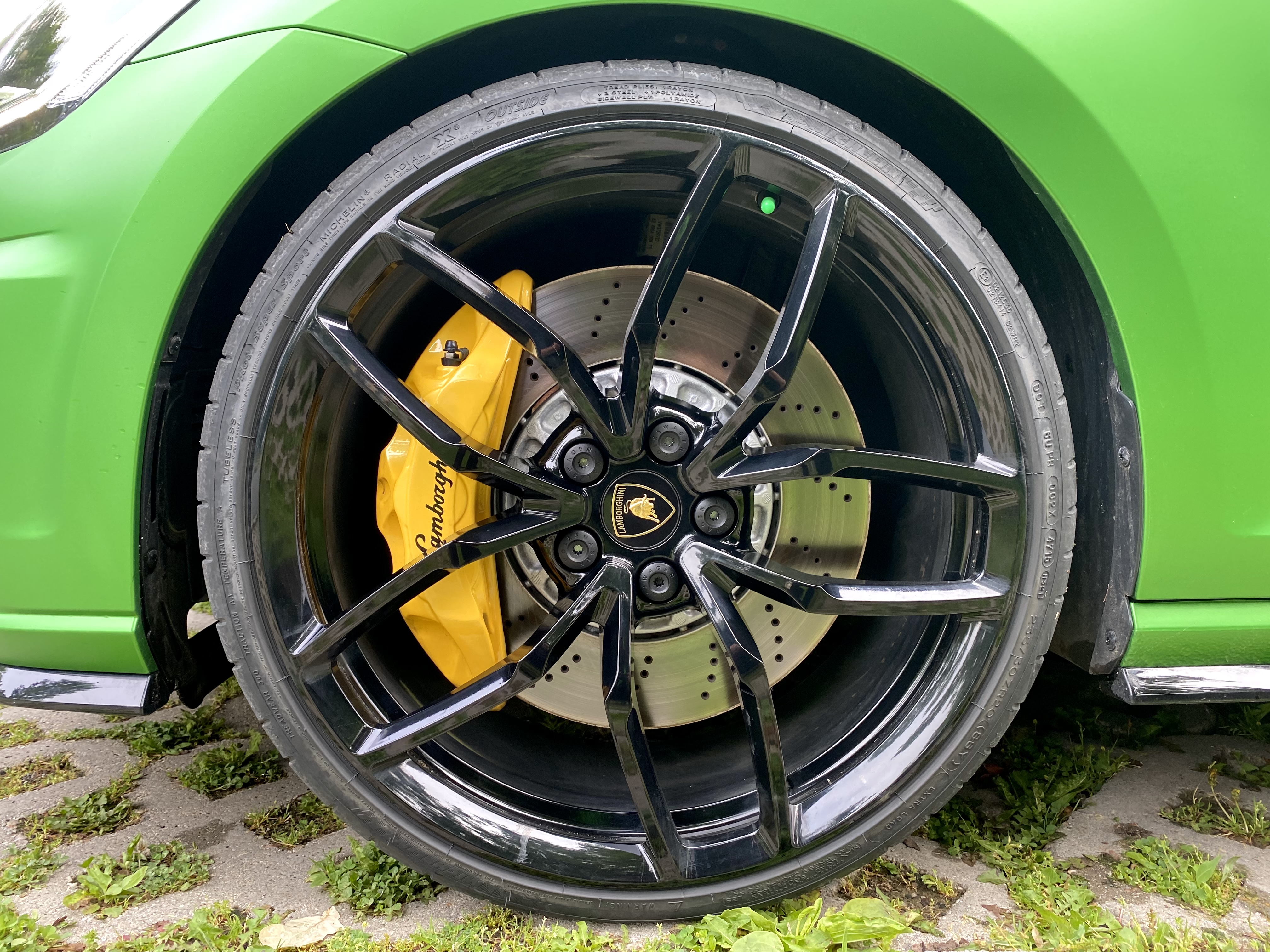 За да ги събера избрах джанти 20х8,5J ET42 - предни от Lamborghini Huracan, които пасват идеално без фланци. Избрах тези джанти, защото тежат само 9,6 кг. Сега отпред джантата е на едно ниво с калника, за сега не съм установил да опира при завой. Избрал съм гума (235/30 20), която запазва обиколката и диаметъра спрямо оригиналните гуми (235/35 19). Апаратите могат да се съберат и в 19, а дори може би и в 18 джанта (за последното не е сигурно, ако намеря подходяща, ще пробвам), но трябва да има правилната широчина и ЕТ. Фланците също са опция, но например опитах оригиналната джанта Pretoria, която е 19х8J ET 50 с 15 мм фланец и не е достатъчно, трябват още един-два мм. Само че в този вариант излиза повече от това, което на мен ми харесва от калника, а и не знам колко ще е сигурно.