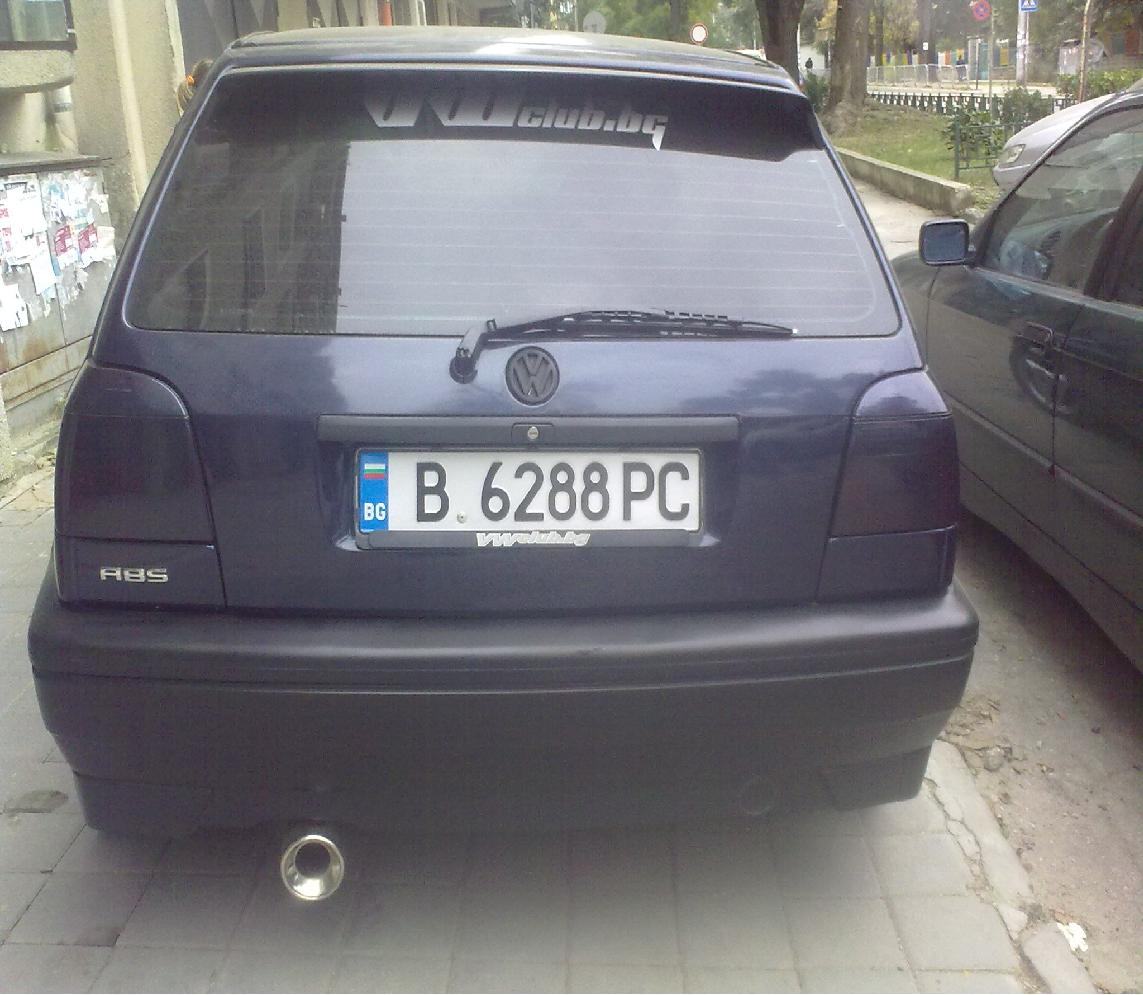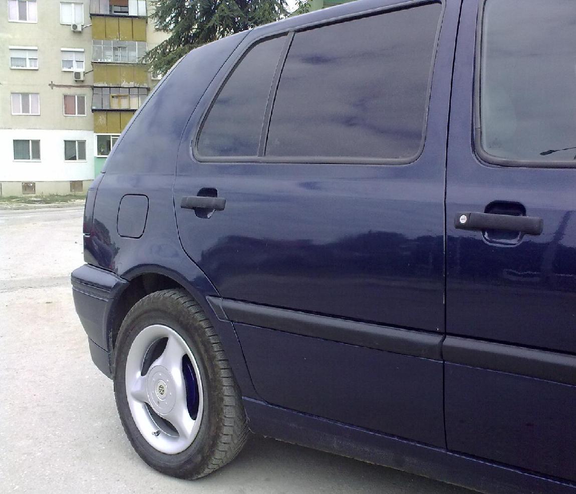 Здравйте колеги преди около година баща ми купи голф 3.Той ми обеща,че като взема книжка ще ми го подари и така лека полека се зарибих по марката.След като влязох в клубът започнаха промените.За няки неща по колата съм ги взимал само аз,но има и такива които заедно с бащата сме плащали.Има случаи в които само тои е плащал.Ето малко снимки на колата.Първите неща бяха затъмняване на стоповете и стъклата както и освежаване на джантите както и боядисване на барабаните сини