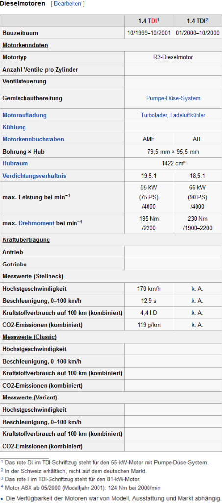 66 kilowatts (90 PS; 89 bhp) @ 4,000 rpm; 230 newton metres (170 lbf·ft) @ 1,900-2,300 rpm — (ATL:- VW Polo: 01/00-04/00, 11/14- ) (A2: 11/03-08/05)