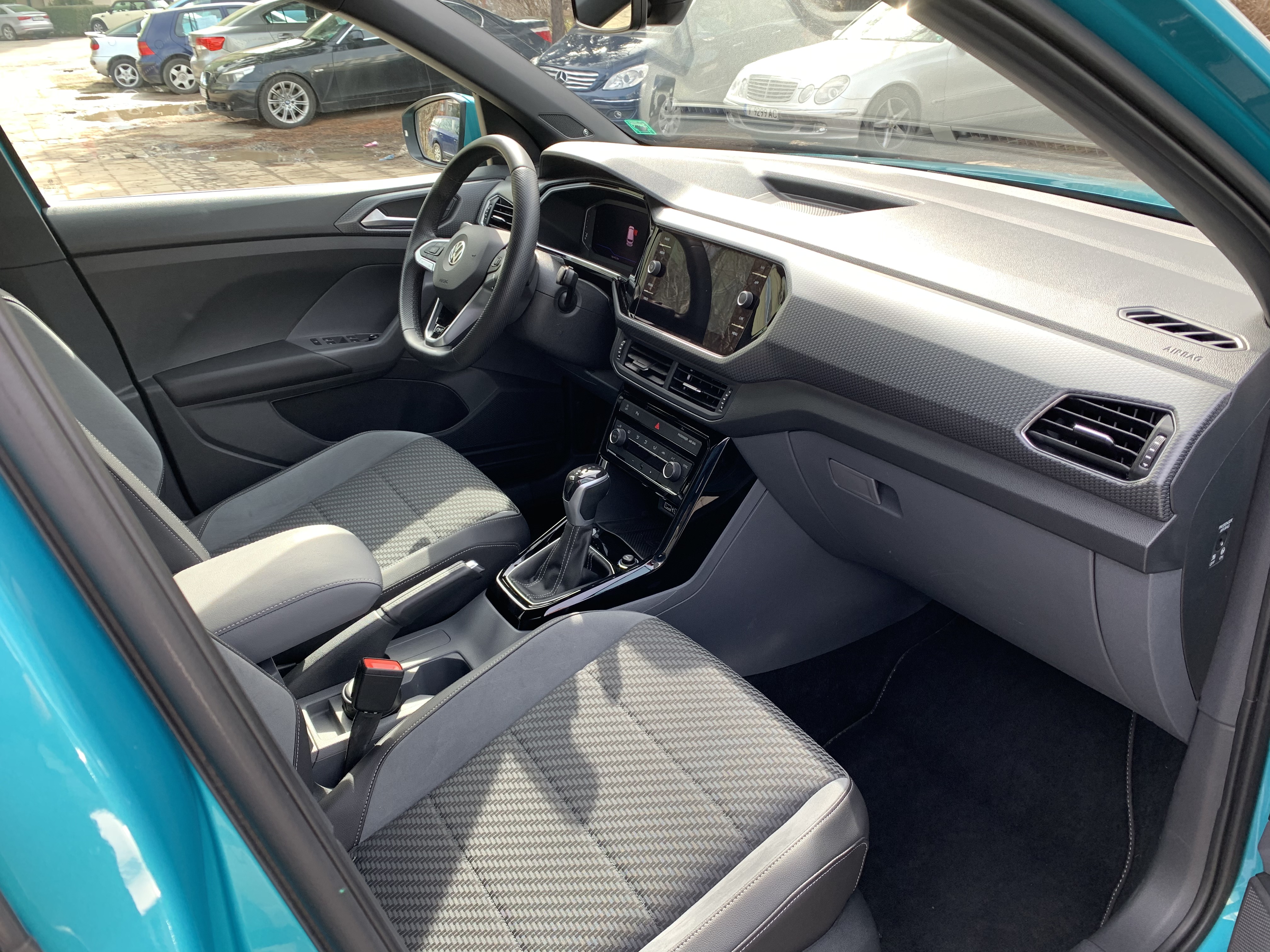 И изведнъж забелязах T-Cross. Нещо в тази кола ме хвана от пръв поглед. Не знам дали е заради сдвоените задни светлини, което супер много я отличава от останалите VW, или заради супер подредения интериор (поне за мен) без щръкнали таблети и грозни вертикални дюзи за парното... не знам. Всъщност знам. Като седнах в T-Cross далеч не се почувствах като в малка кола. Да, челното стъкло не е панорама като на лимузината, но е напълно достатъчно. Никакви проблеми с видимостта, никакви стърчащи таблети, огледалото стои високо а не директно пред погледа ми, страничните огледа са си на местата на колоната, а не стърчат от вратата. Няма триъгълни прозорчета ала москвич отпред.