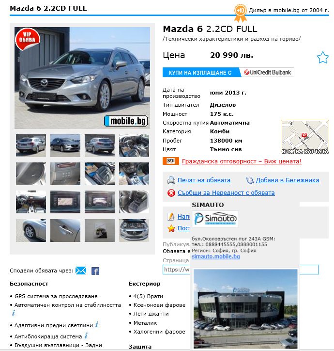 Автокъща SIMAUTO, в София срещу РИНГ мол. Обява за автомобил Мазда 6 на 138 000км. в перфектно състояние. Дават съгласие да се тества в сервиз и платих 70лв за транспорт на автомобила и 84лв за самият тест (продължил малко над 1 час) при оторизираният представител за България - Стар Моторс.