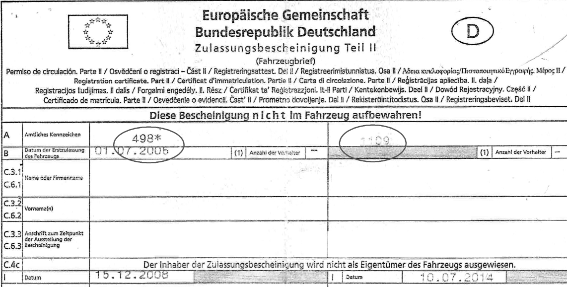 И последно: Потвърждението за реимпорт виждам от малкия талон, където под цифра 2.2 са вписани само нули. Това е методът на немския Кат да отбелязва реимпортите: