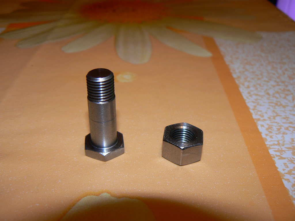 van4ooo, до колкото разбрах самата корона е закалена и самото разпробиване ще стане предполагам не в гаражни условия ами някъде другаде където имат специални машини и видии, не съм запознат, пък и стругаря след като не предложи тоя вариант, явно тези болтове ще свършат работа. Разпробиването означава и по голяма дебелина на болта, съответно и по голяма гайка, но тук трябва да се има впредвит, че гайката трябва да е с такъв размер, че да може да влезе шестограм след това и да се стетгне, в случая гайката е направена да се стяга с флошка 14.
