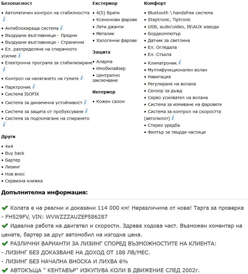 Сложили са VIN за проверка WVWZZZAUZEP586287. По него направих справка за колата: