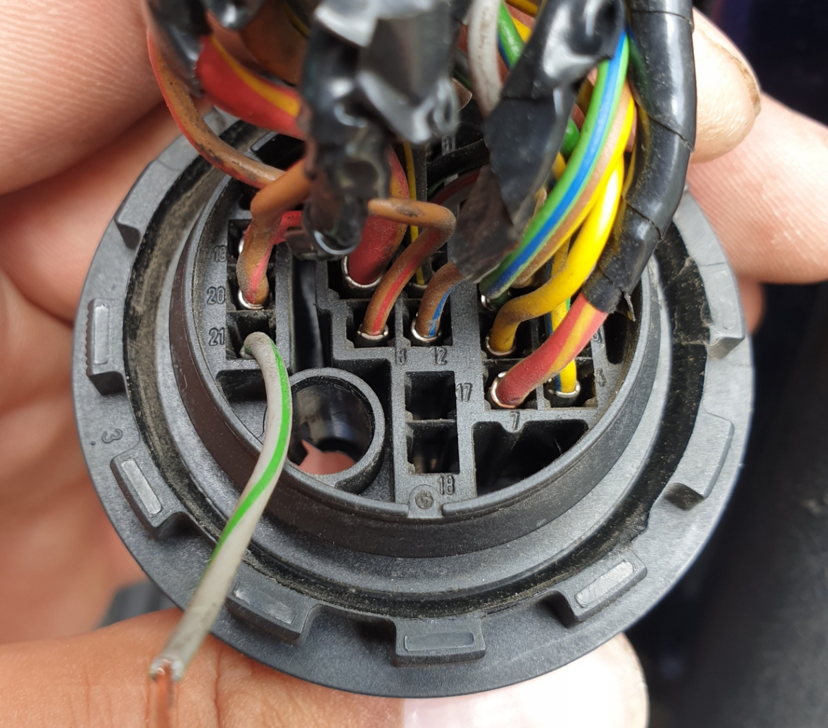 Колата е Sharan 1.8T 2002г. Кабела е в маншона на шофьорската врата и е под номер 21 в кръглата букса на вратата.