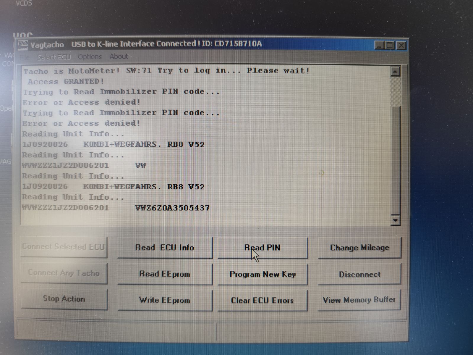 С VAG Tacho прави връзка, разпознава ECU info, но като натисна рийд да прочете пина ми отказва достъп.