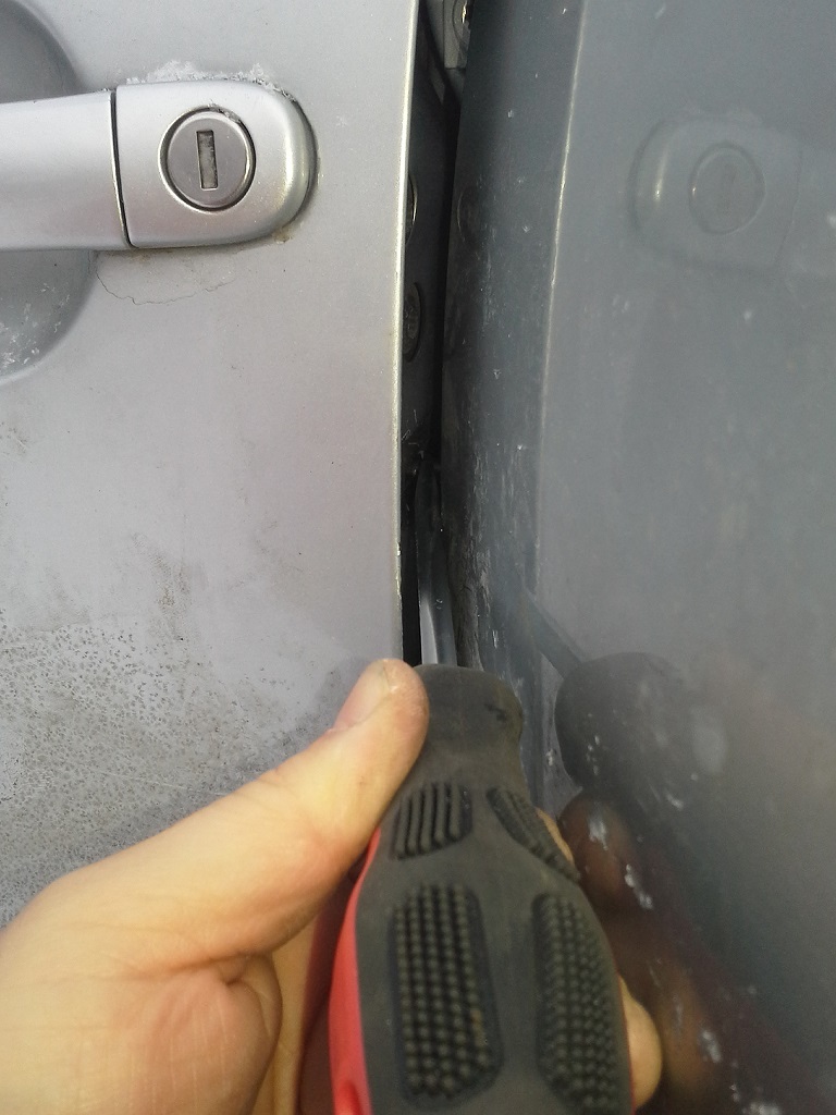 3. Заставам между задната врата и задната седалка при отворено положение, слагам щангата така, че като я бутам има опора на гредата между 2-те врати и избутва шофьорската навън за отваряне, като в същото време дърпам външната ръчка на вратата. Ако са 2-ма човека става по-лесно, но при мен нямаше тази възможност