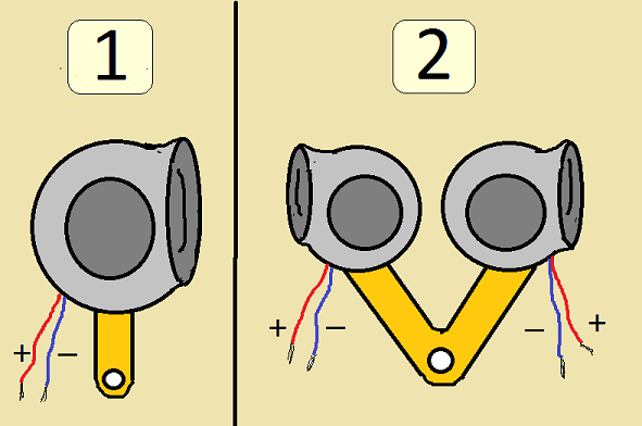 Здравейте Колеги ,моят клаксон си беше най-обикновен (като на снимка 1) но нещо се прецака и сега ми попадна един,но двоен (като на снимка 2) Как да го свържа като двойния е с 4 жици,а от колата излизат само 2??