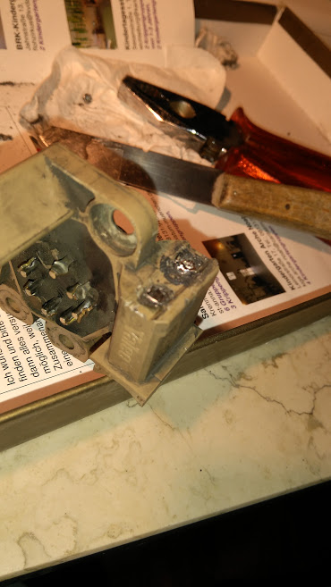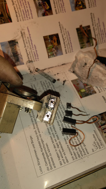 Как да достигнем до регулатора се подразбира от снимките. Основния момент е как се махат старите четки. Тези стърчащи пластинки от задната страна на всяка от четките трябва да се отреже до основа така , че там да стане съвсем равно. После с поялника само докосва и старата четка се изстрелва сама заради пружината. После се монтира по пбратен ред новата като най добре да се прокара жицата през малкия отвор посредством прекаран преди това обикновен конец.