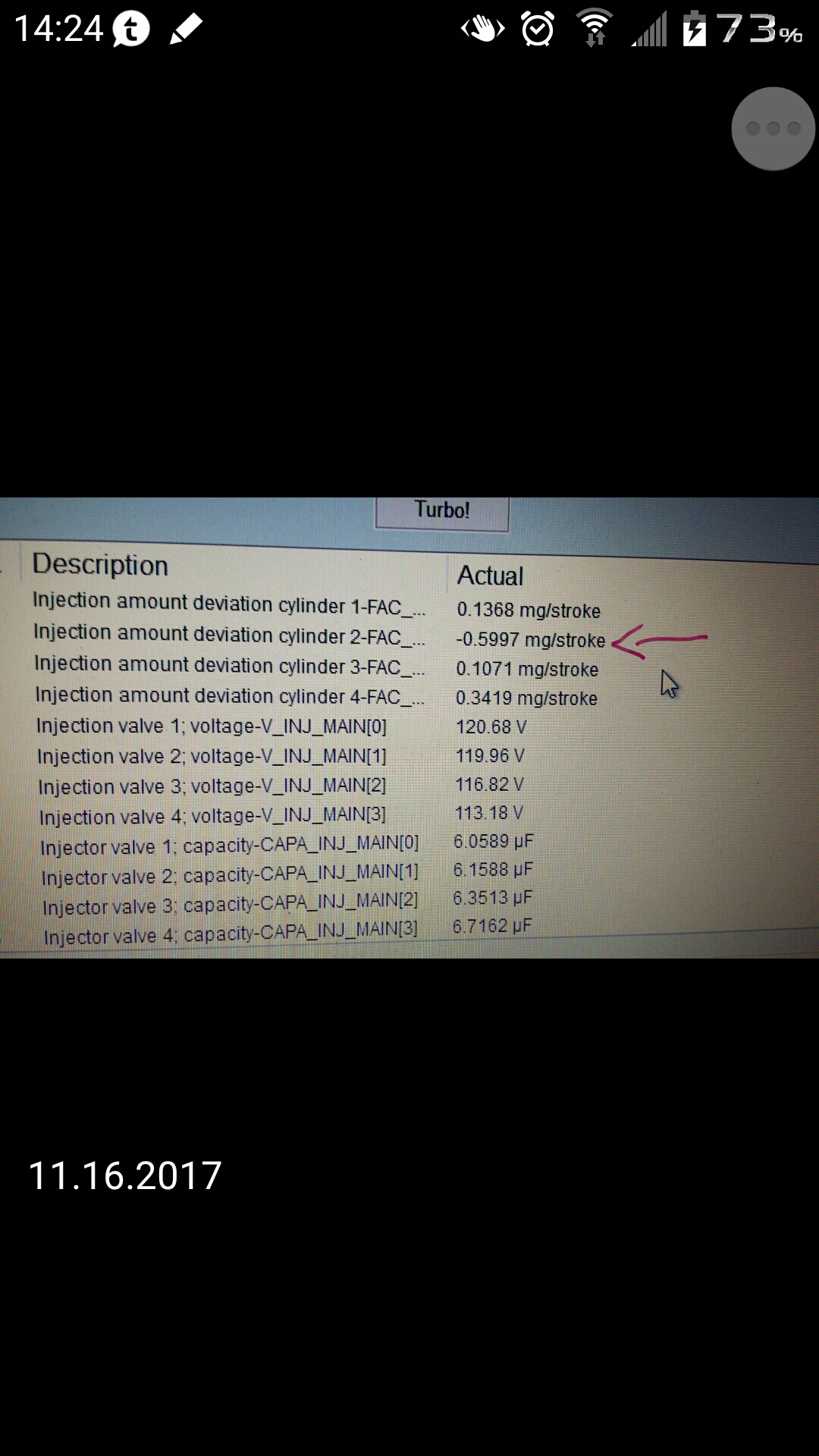 Колеги днес направих диагностика със стария кабел 12.12 мисля,че беше на голф 6 1,6 105 к. и стойностите на втора дюза малко ме притесняват.Моля за компетентно мнение.Двигателя работи равномерно и видимо няма проблеми.