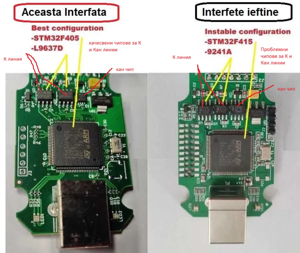 2. Адаптер с процесор STM32F405. Това е адаптера с процесор, който е доста по бърз и поддържа UDS. Тоест на него може да разчитате на новите протоколи и да правите диагностика на автомобили до към 2022-2023 година. Минусът му не е малък, а именно, че е заключен и работи само с версията, която ви се предоставя. Не може да се флашва, не може да се чете, не може да се трие. При опит за флаш по какъвто и да е начин, става абсолютно неизползваем и отива в кофата. Към момента няма решение за възстановяването им, дори след подмяна на процесора с нов празен. При инсталирането и използването на софтуера с който идва, задължително интернета се спира. Ако по времена на инсталиране или работа, интернета е включен, софтуера започва да прави бъгове (зависване, блокиране, забиват живи данни и т.н.).