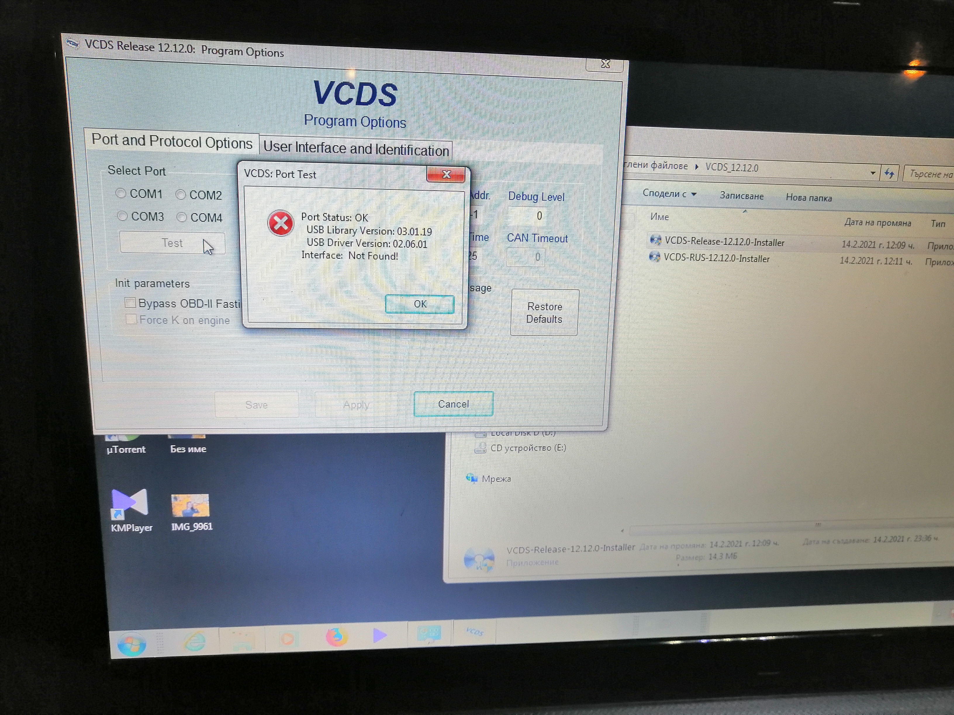 Това е проблем с версията към която имаш хардуер. За съжаление, китайските клонинги идват с различен firmware 1.84, 1.92, 1.96. Според тоя firmware, идва с него и тяхна програма с диска. Това не означава, че ако е версия 12.12.0, ще работи с друга програма със същите цифри на версията, защото тази, която идва с диска не се знае коя е точно, въпреки че има цифри за версия. От многo време, китайците, просто променят цифрите, като надпис, а реално вътре е доста по стара версия. Това е маркетинг, за да могат да продават. Сигурен ли си,че версията е 12.12.0, а не 12.10.0, 12.10.1, 12.12.1, 12.12.3 или друга версия? Ако се хване точната версия, която е била на диска, или пък точния firmware, ще тръгне, защото тя е свързана със софтуера в чипа на адаптера.