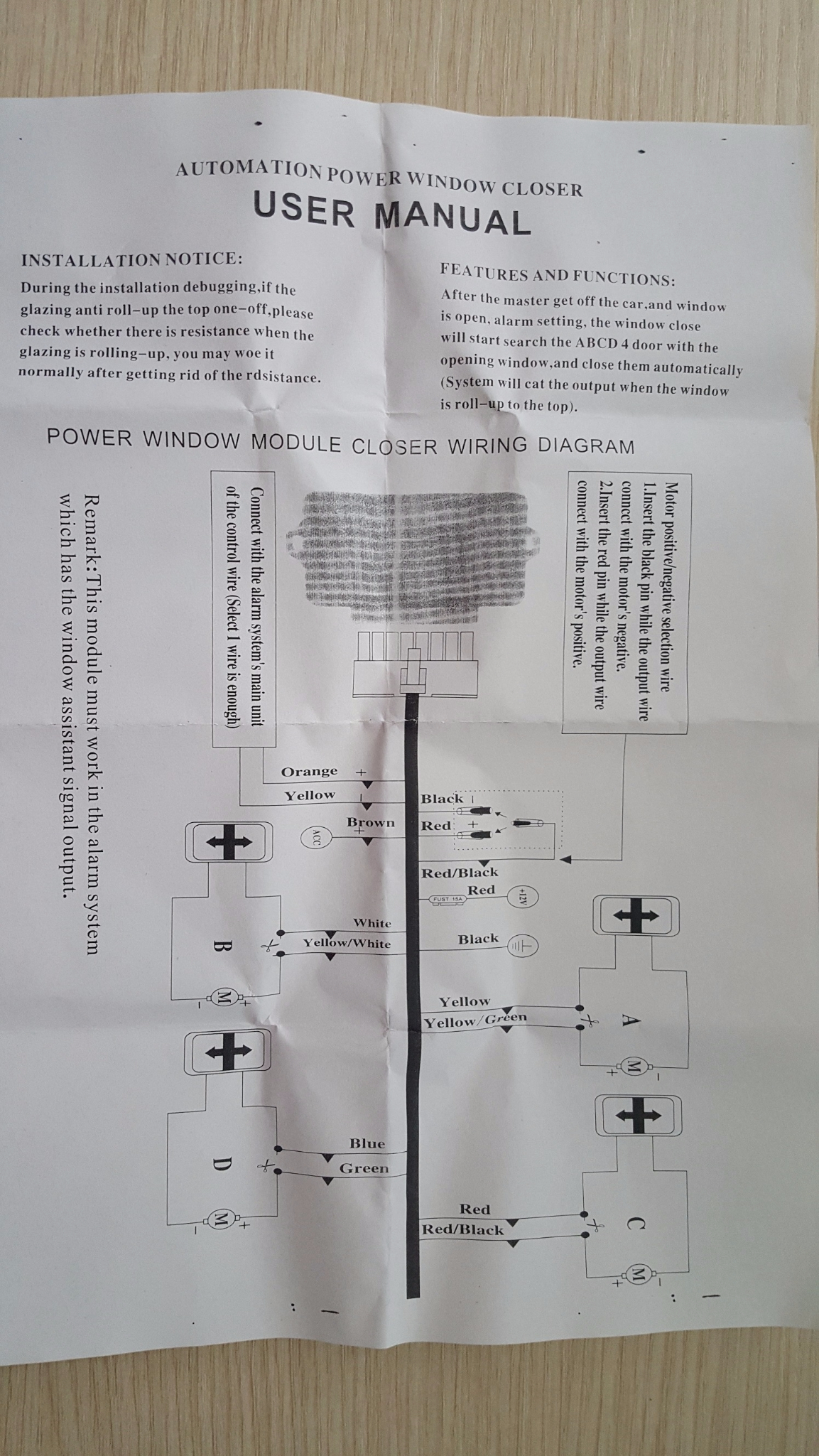 Към всяко двигателче отиват по два проводника от новата система: един проводник за вход ,свързан към оригиналната инсталация,и един изход ,към самото двигателче.Проводниците с трите букси са за програмиране на изходният проводник(свързан към двигателчето),какво напрежение да подава + или -.Например: програмираш да подава +12в.Проверяваш с пробна лампа ,при вдигане на стъклото на кой от двата му проводника има +12в.Прекъсваш този проводник и го прекарваш през новата система : пров. от колата - вход нова система - изход нова система - двигателче. Описанието е валидно само за стъкла без комфорт модул!- ivan_pop