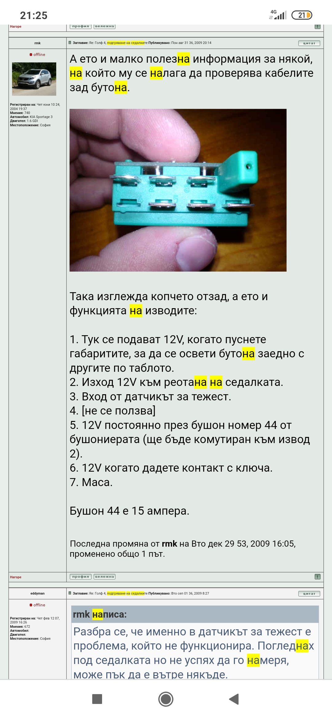 golfmaniak666 написа:На тази снимка е купунга който се включва към седалката.На него подавам напрежението на номер 4 а на номер 3 го свързвам към маса. Другите два кабела са за датчик за заетост номер 2 и го пускам до копчето съответно на Пина който е даден според предната схема.а последния тънък кафяв проводник не знам за какво е