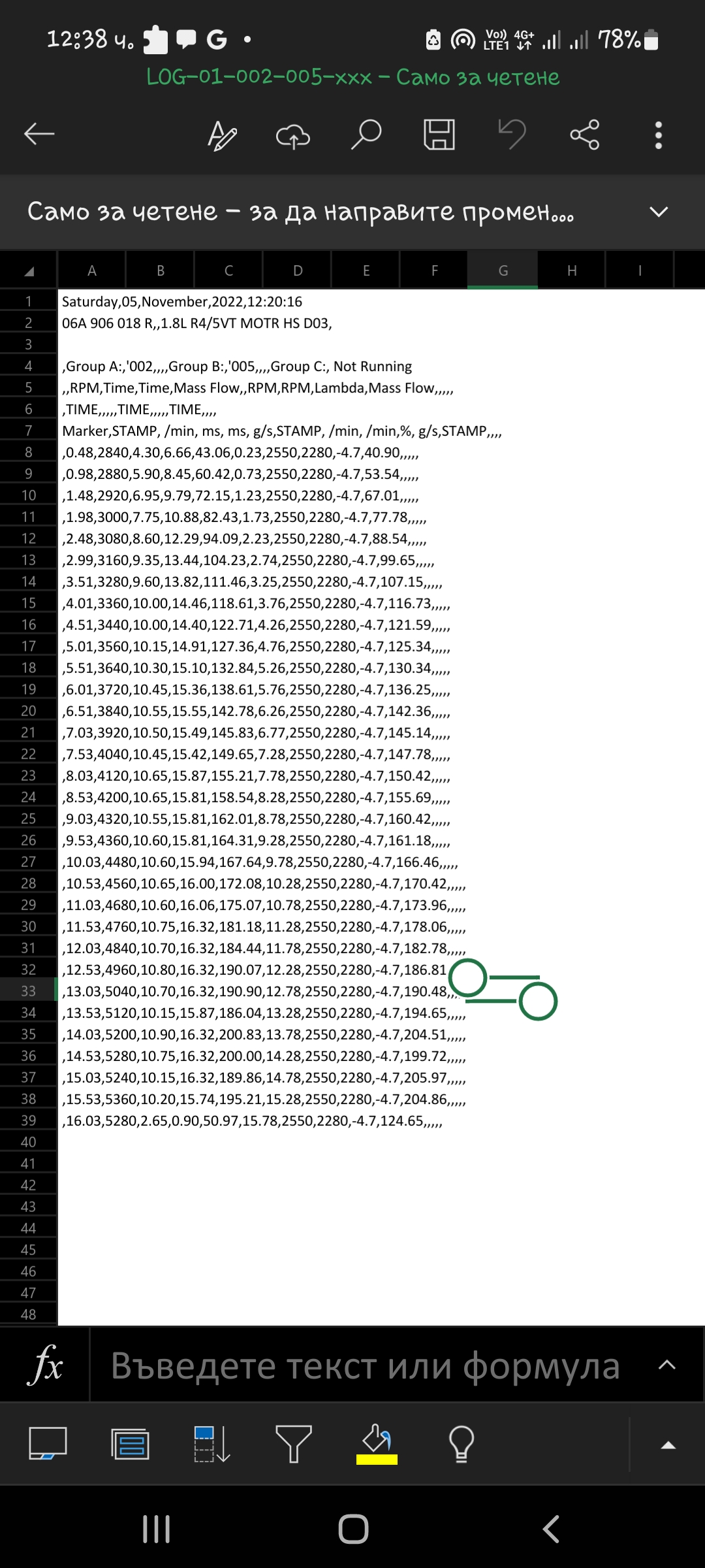 Здравейте, карам голф 4 1.8т AGU 1999г стокова е 150хп, но е с турбо TD-05 20G и уж трябва да е 276хп но нямам графика, проблема е там че в началото като я взех преди 2 3 месеца не си искаше гумите а сега като я настъпвам турбото си прави налягане 1 бар, но не залепя изобщо, преди няколко дни я закачих и излезе грешка за ламбда сонда и почна да прекъсва да работи неравномерно, вчера я смених с друга грешката изчезна, ама даже още по бавно взе да набира, преди малко направих лог на 2ри и 5ти канал с диагностика за дебитомера от 4 предавка с газ до долу почти до прекъсвач, мога и на някой друг канал да направя но не знам на кой трябва, качвам това което направих и благодаря ако някой помогне.