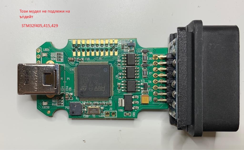 2. Адаптер с процесор STM32F405. Това е адаптера с процесор, който е доста по бърз и поддържа UDS. Тоест на него може да разчитате на новите протоколи и да правите диагностика на автомобили до към 2022-2023 година. Минусът му не е малък, а именно, че е заключен и работи само с версията, която ви се предоставя. Не може да се флашва, не може да се чете, не може да се трие. При опит за флаш по какъвто и да е начин, става абсолютно неизползваем и отива в кофата. Към момента няма решение за възстановяването им, дори след подмяна на процесора с нов празен. При инсталирането и използването на софтуера с който идва, задължително интернета се спира. Ако по времена на инсталиране или работа, интернета е включен, софтуера започва да прави бъгове (зависване, блокиране, забиват живи данни и т.н.).