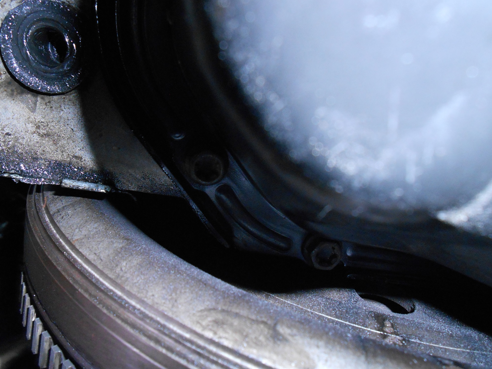 В камбаната на кутията е доволно опръскано с масло. Маслото е черно, явно е двигателно.