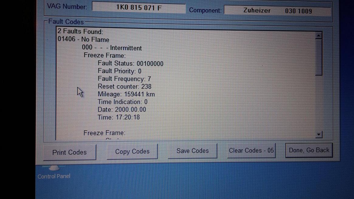 Като запаля колата и пусна климатроника след няколко секунди печката тръгва (почва да пуши). Като изключа колата след около 10, 15 минути и я закача на компютъра ми дава грешката - 01406 - No flame (долу ще кача няколко снимки). На другата сутрин печката пак тръгва. Но ... не знам кога, вече изкарва и друго съобщение 01409 - Repeated Flame-Out. Тогава, май печката не тръгва, докато не изтрия грешките. Има и няколко снимките по време на работа на печката.