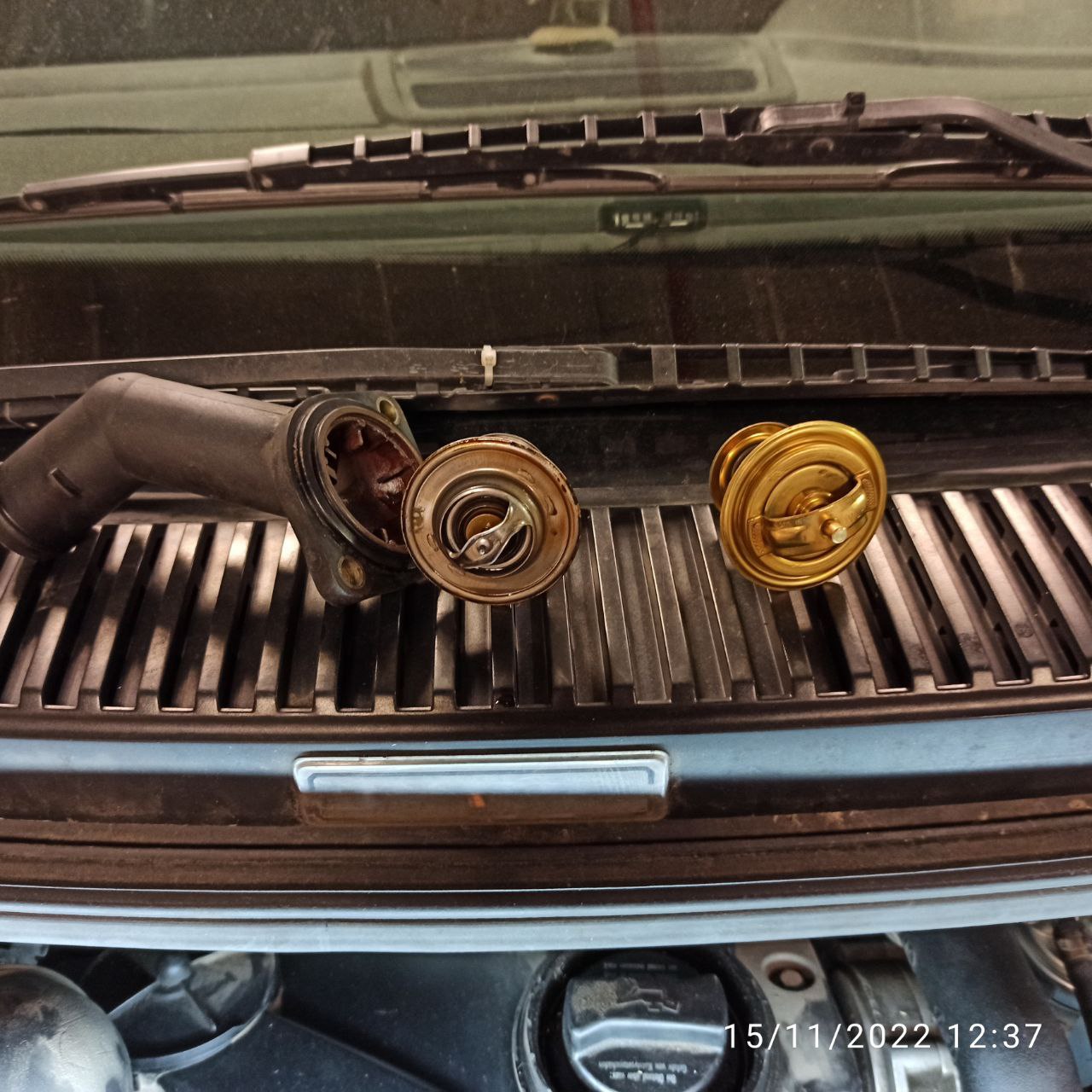 Също си провери тройника с датчика за климатроника зад трапеца на чистачките преди входа към 2 цевката към радиаторчето. Напуква се . При мен като свалях скобите се разпадна - ако беше извън града - голяма греда , як теч в завряно място / сваляш целия механизъм на чистачките. Имаш някакъв шанс , ако имаш клещи за тия скоби за да свалиш датчика от маркуча към 2 цевката и да сложиж бай пас, ама е голям гърч./Аз като сменях радиаторчето сложих червячна о това ми помогна после./
