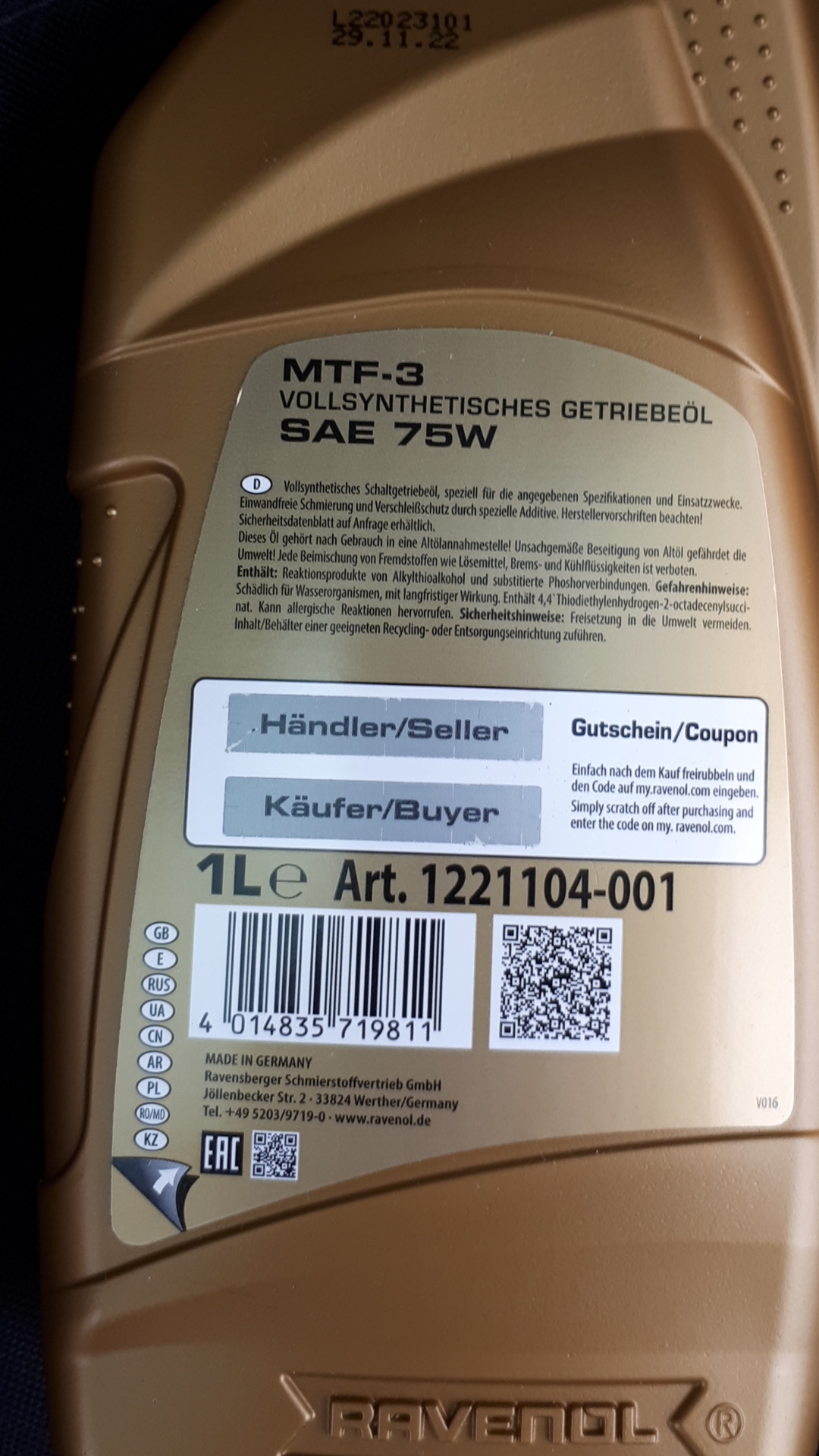 В дилъра на VW в Търново за моят пасат б6 2009 година излезе това масло. То заменяло цитираното от тебе по-горе, което е 80лв и по техни думи вече е било спряно от производство. Иначе на по-старата кочина голф4 1.6 105 коня ръчка я карам вече над 100к км с MOTUL GEAR 300 75W-90. Сменям го през 50к км.