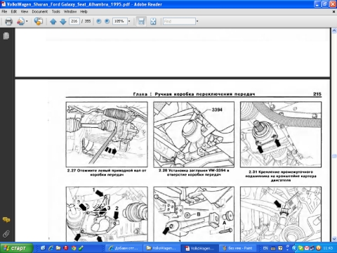 т.31 . Отвийте крепежа на междинния лагер/стрелките на картинка 2.31/ от корпуса на картера и премествайки лагера извадете междинния вал от ск.кутия. При необходимост вала от ск.утия отожмите -/това не мога да го преведа/. Заб. на автомобили произведени след 01.1997, е поставена променена опора на междинния вал. Закрепващите болтове при нея се намират над вала.