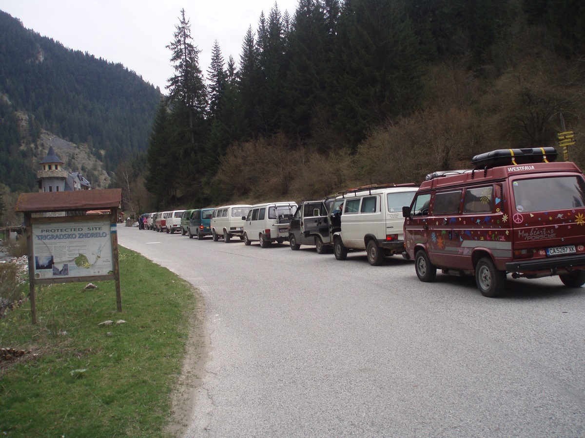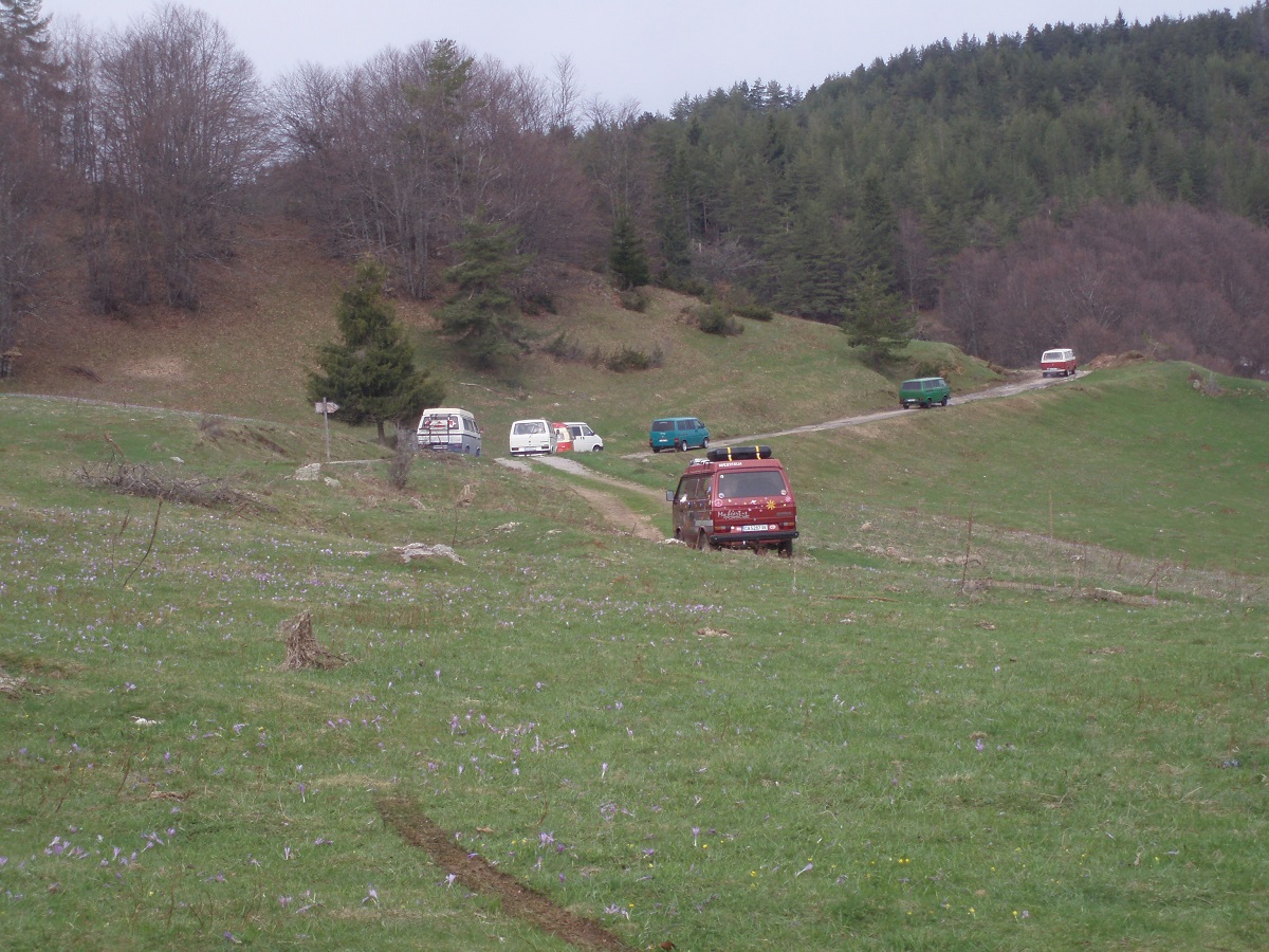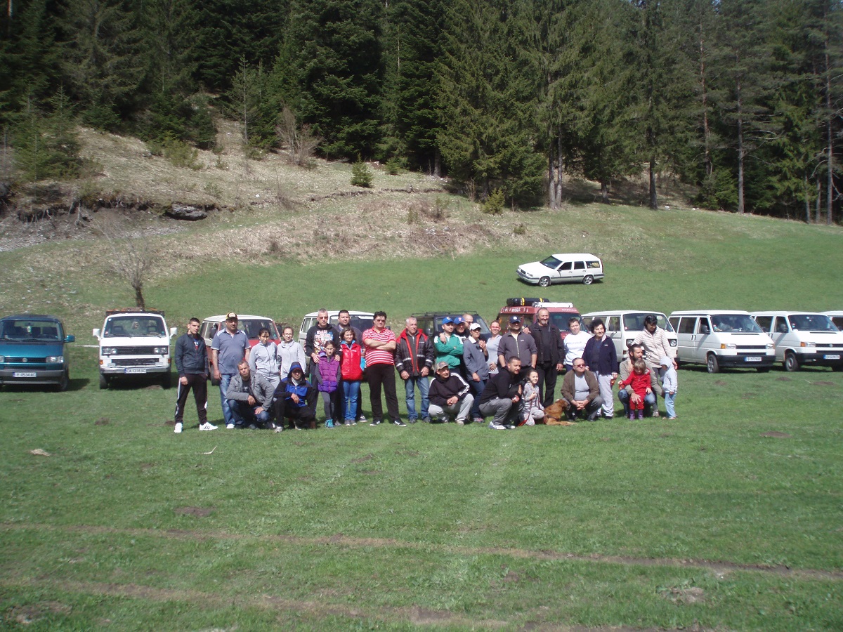И така, най накрая стигнахме до сервиза на Ицо,от където се даде началото на разходката.Придвижването до Асеновград се оказа малко бавно и затова закъсняхме.На място решихме ,че най-добре е да намерим една поляна на около 30-40км от Асеновград за първата вечер. Ицо ни каза за една такава над Хвойна. За съжаление буса на Димчо беше аварирал и се наложи да остана с него, докато другите тръгнаха към поляната.След бръз ремонт, потеглихме и двамата....но аварията пак се обади и Димчо се върна за повторно ремонтиране.Пътя към лагера се виеше през гората и природата....Накрая се стига до една голяма поляна и на нея Ивчо беше построил лагера...Бусовете бяха наредени почти в кръг около основните шатри...с изключение на един......но това е друга тема за разговор.На места имаше и все още сняг и не се стърпях, залудях по баирите..и....забодох синхрото в едната преспа......За съжаление доста се изложих......окопах се като пиле в калчища и се наложи Мирко с оранжевото синхро да ми помогне малко.Вечерта мина както обикновено....ракия, салати и две китари.....С бат Заре отново се разпяхме....Шатрите бяха пълни с весели и щастливи бусаджии на които им беше приятно.Ние с Ивчо също бяхме щастливи, тъй като едно на пръв поглед невинно събиране се превърна в един мини бус събор на приятно място.