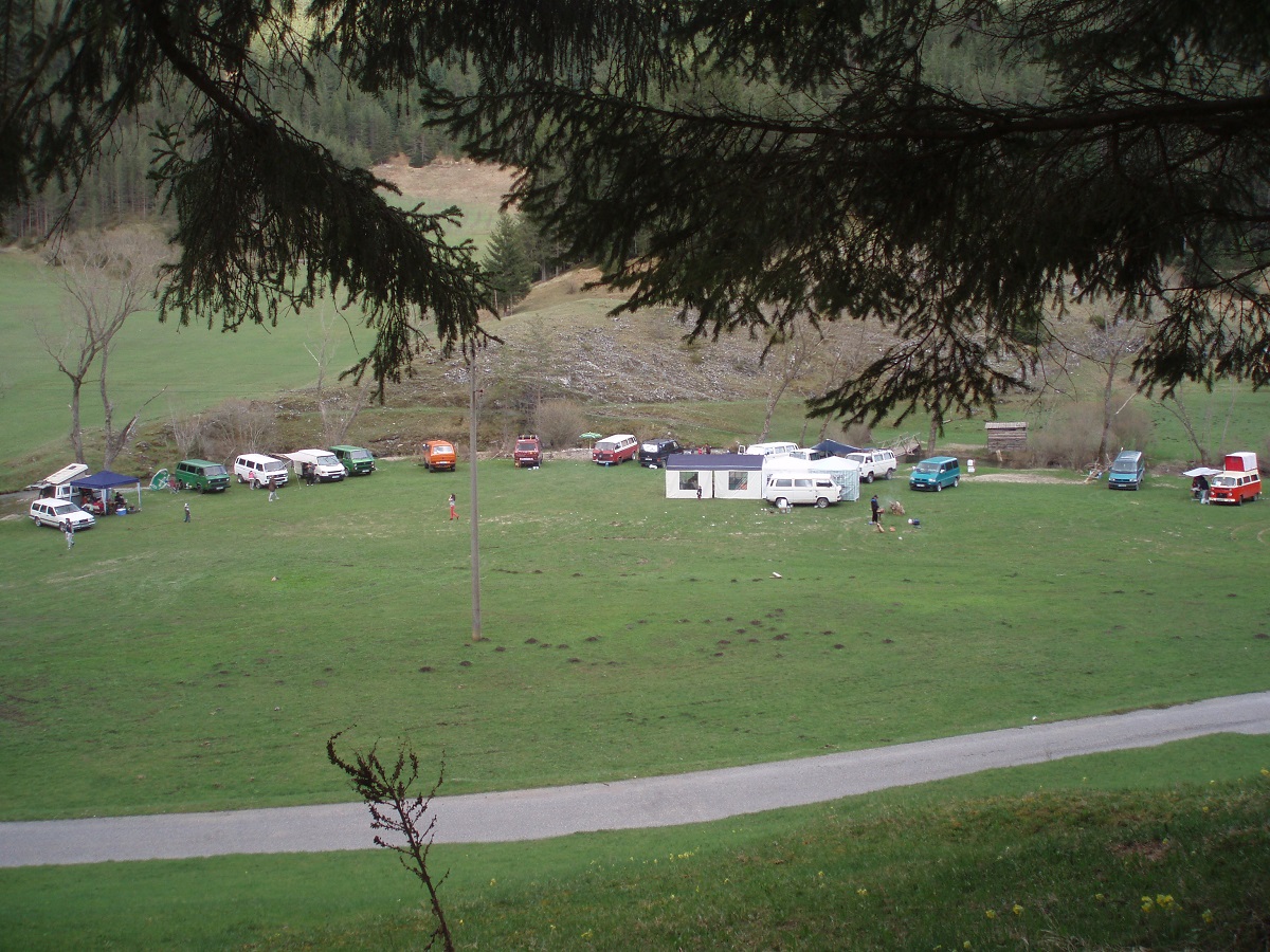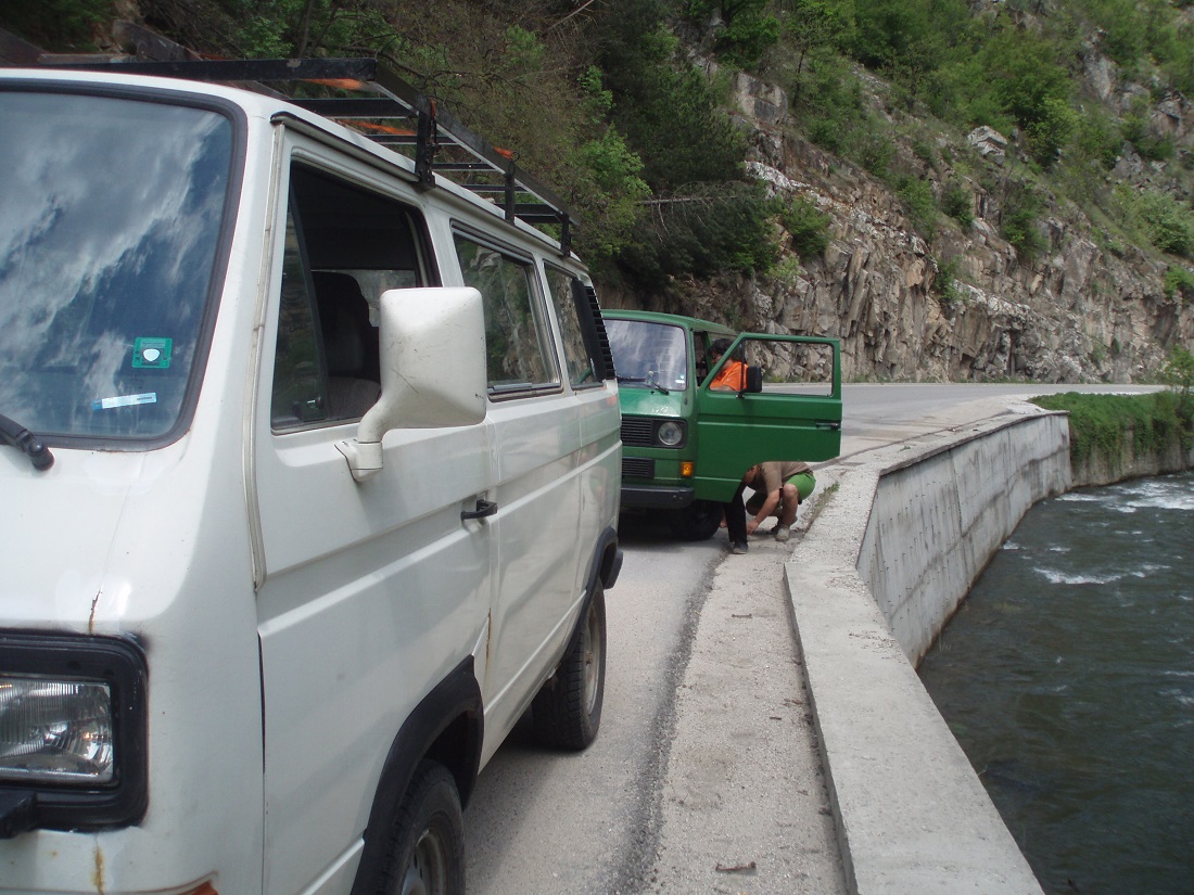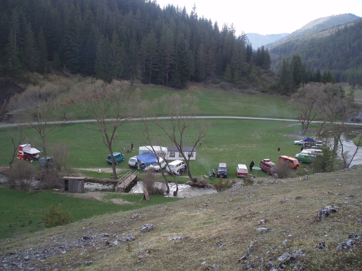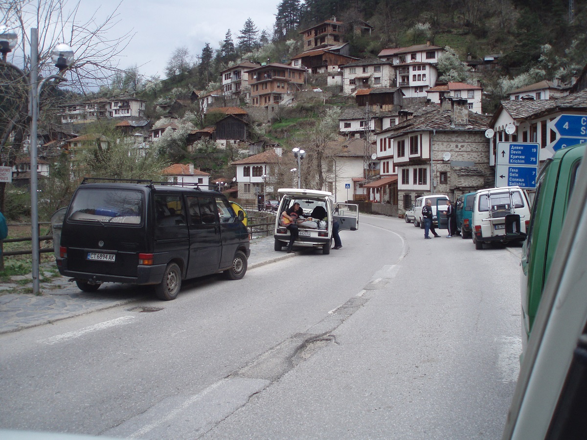 И така, най накрая стигнахме до сервиза на Ицо,от където се даде началото на разходката.Придвижването до Асеновград се оказа малко бавно и затова закъсняхме.На място решихме ,че най-добре е да намерим една поляна на около 30-40км от Асеновград за първата вечер. Ицо ни каза за една такава над Хвойна. За съжаление буса на Димчо беше аварирал и се наложи да остана с него, докато другите тръгнаха към поляната.След бръз ремонт, потеглихме и двамата....но аварията пак се обади и Димчо се върна за повторно ремонтиране.Пътя към лагера се виеше през гората и природата....Накрая се стига до една голяма поляна и на нея Ивчо беше построил лагера...Бусовете бяха наредени почти в кръг около основните шатри...с изключение на един......но това е друга тема за разговор.На места имаше и все още сняг и не се стърпях, залудях по баирите..и....забодох синхрото в едната преспа......За съжаление доста се изложих......окопах се като пиле в калчища и се наложи Мирко с оранжевото синхро да ми помогне малко.Вечерта мина както обикновено....ракия, салати и две китари.....С бат Заре отново се разпяхме....Шатрите бяха пълни с весели и щастливи бусаджии на които им беше приятно.Ние с Ивчо също бяхме щастливи, тъй като едно на пръв поглед невинно събиране се превърна в един мини бус събор на приятно място.