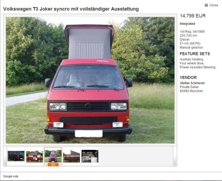 Westfalia-Aufstelldach - GFK - mit Gepäckwanne. Faltenbalg (neu) mit Fenster vorn, Dachlüfter (29x39 cm), Bett, Breite 122 cm.