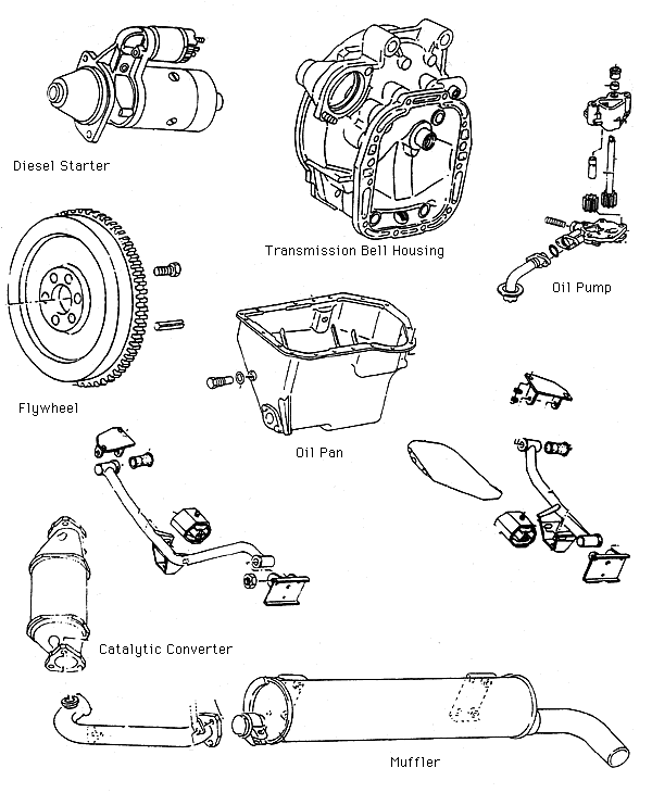 Двете опорни греди с тампоните за закрепяне на двигателя, двете опори на двигателя, картер, маховик, маслена помпа, фланец на ск.кутия, опашката на ск.кутия, стартер и ауспух.Всичко изброено е от дизелов бус 1.6D - 1.6TD.