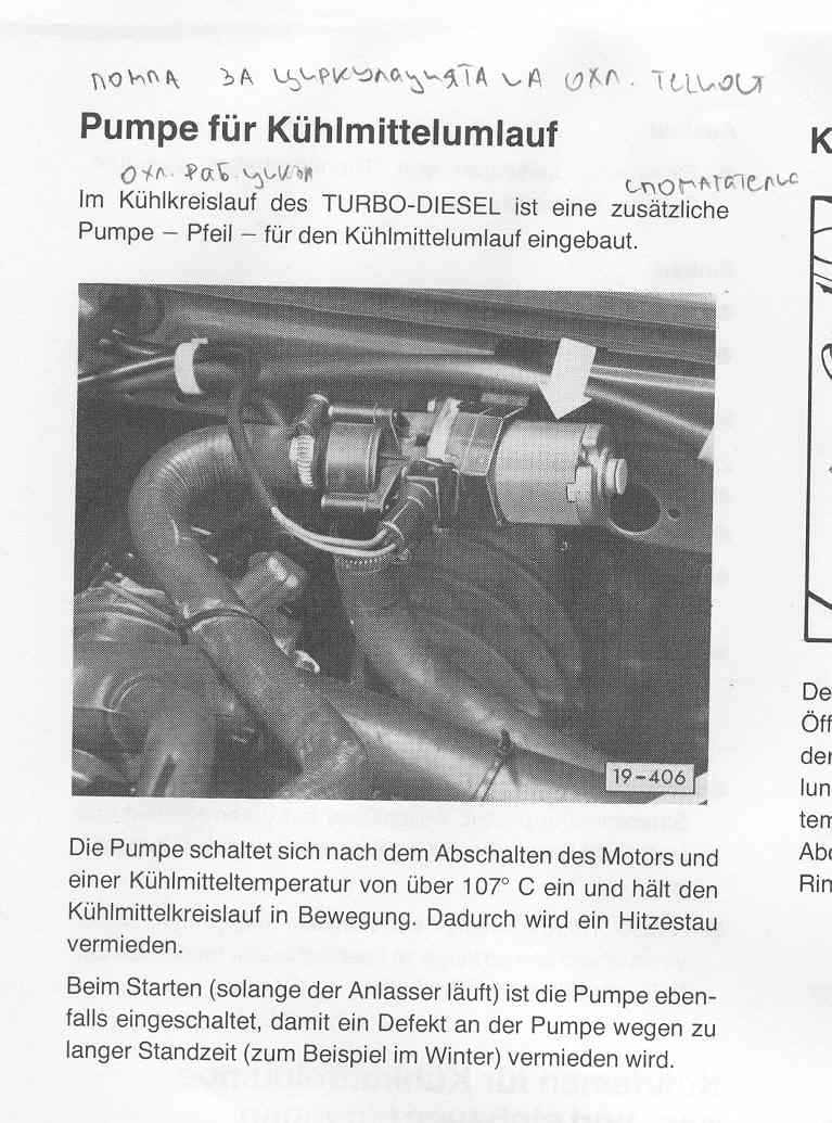 Идеята е при изгасяване на топъл двигател, тази помпа да циркулира известно време, за да не прегере локало главата и да се изкриви. На Т4 е направена да работи само при изгасен двигател. За Т3 може да е въдедена в последните години на производство, но как трябва да работи не знам.