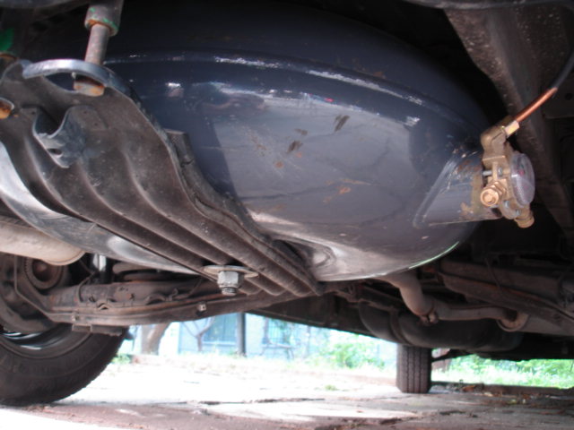 Аз оставих само ъглите. и отгоре подсилих с плоча ето така. Бутилката е италианска, и в средата има една тръба (вътр. диаметър около 20мм. или 3/4 цола) фабрично заварена така, че да се оползотвори максимално добре обема, и това и улеснява и опростява захващането за пода на багажника. Освен това съм сложил и шината под бутилката, и е захваната като в сандвич, а не виси изцяло на дъното на багажника...