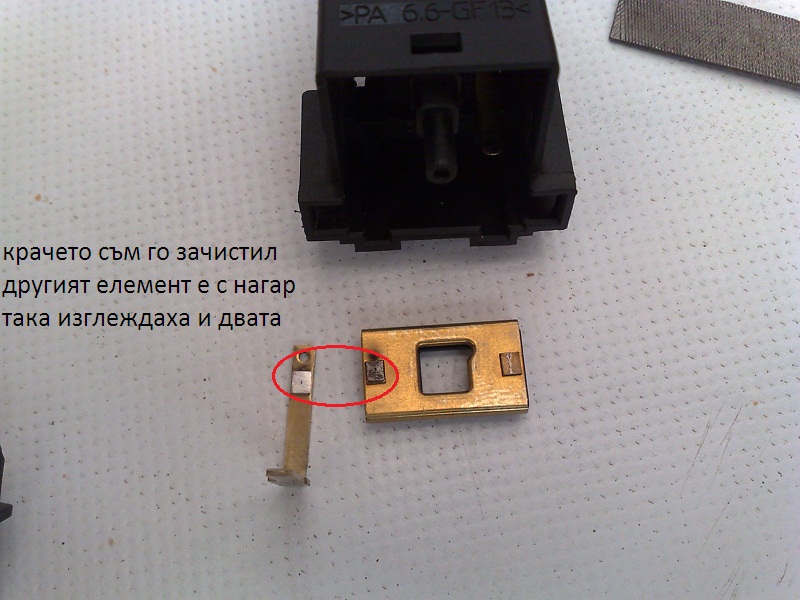 след година и нещо безпроблемна експлоатация на машината отново светна лампата за подгрева,изчетох всичко свързано с проблема във форума и при мен се случва едентично с колегите,светещата лампа и предръпването на мотора това което разбрах е че трябва да се обърне внимание на стоп машинката за лампата и реле 109 за предръпването,и така почна всичко по реда си свалих стоп машинката оказа че съм с една четири пинова предполагам това елиминира другата макари да имам отвор за втора,разглобих я оказа се че два от контактуващите елементи имаха значителен нагар на снимките се вижда ясно,зачистих ги внимателно с пиличка малко контактен спрей и светнаха като нови,след поставянето на машинката лампата угасна