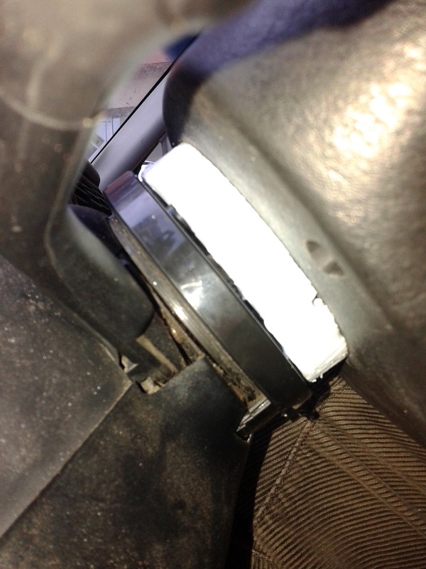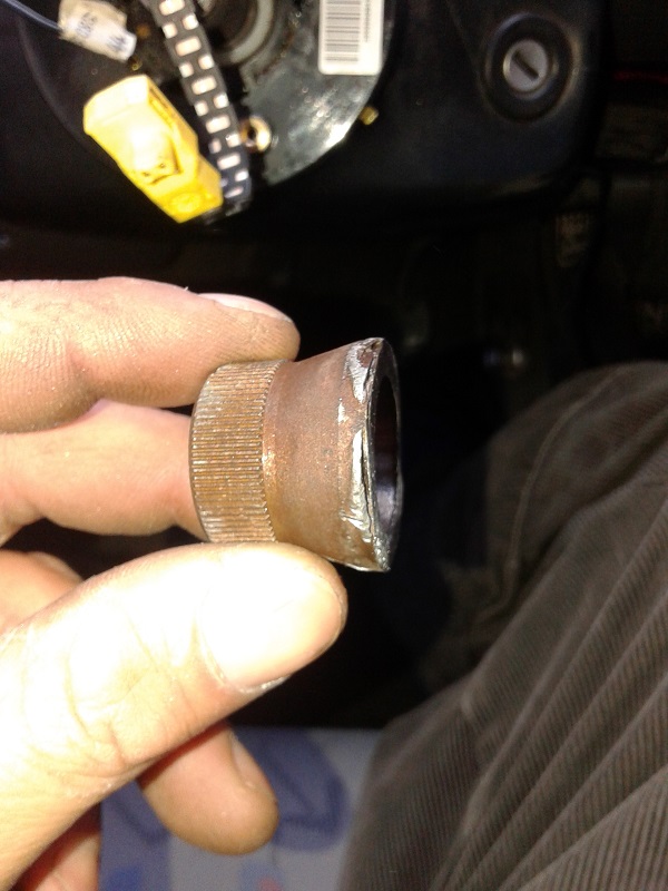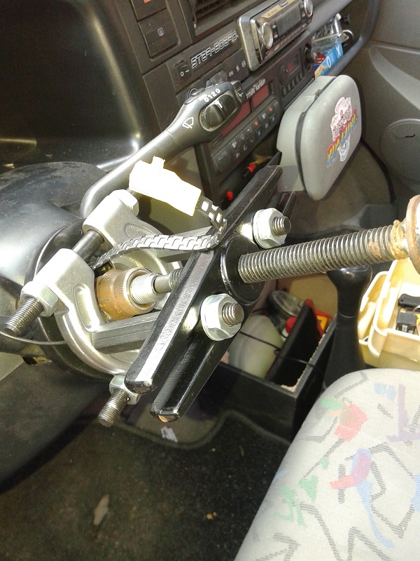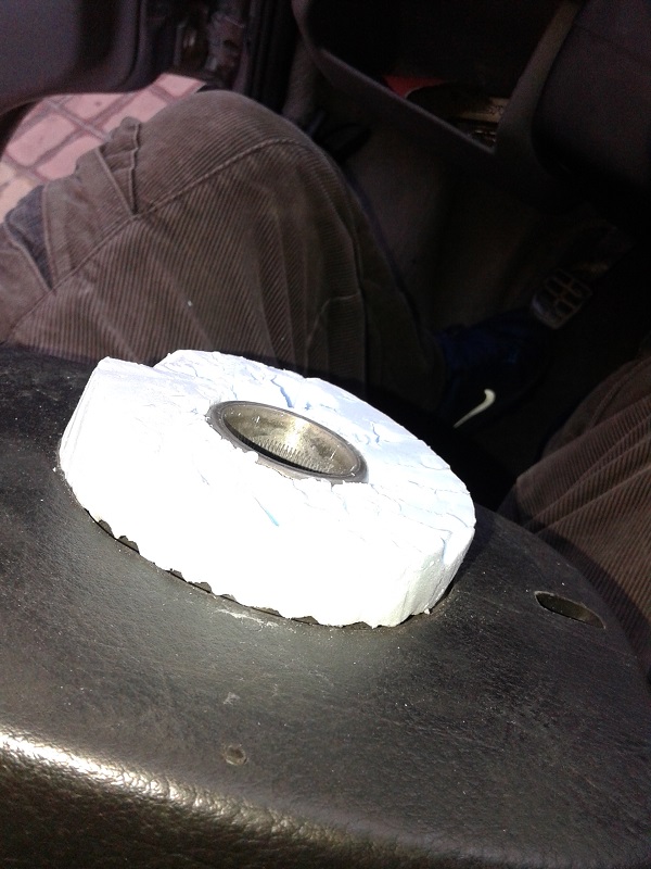 От първата морга купих преходната втулка,от малък към голям диаметър шлици, която, явно, стандартно се набива на кормилния прът, на някои модификации. При монтажа установих, че е прекалено дълбока и притиска механизма на лостчетата. Извадих я, със скоба за избиване на лагери и я отрязах до нивото на технологичния зъб.До тук добре- монтирах волана, но остана голямо разстояние от него, до контактната шайба изключваща мигачите и даваща контакт на клаксона и еърбега, която иначе стои фиксирана с болтове към волана. След известно време размисъл, от какво да направя дистанционна втулка, от волана до въпросната шайба, реших, че фибран е най- лесното решение, защото има достатъчна плътност, а в същото време се моделира лесно и всяка изпъкналост(в конкретния случай трите водача, които иначе влизат в дупки на волана)притисната, го пробива и си прави легло. После с нож и малко сръчност успях да изработя въпросната втулка, или по друг начин казано-удължение за волана.Не стана най- красивият детайл, но аз тъй, или иначе харесвам нещата да са грубовати. В крайна сметка, крайният резултат се оказа отличен, защото сега, воланът стои малко по- близо до мен и при маневриране не се налага да изправям до край ръцете си!