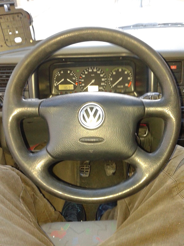 Не беше като, просто, да демонтираш единия и да сложиш другия волан.Ето как протече всичко: От първата морга купих преходната втулка,от малък към голям диаметър шлици, която, явно, стандартно се набива на кормилния прът, на някои модификации. При монтажа установих, че е прекалено дълбока и притиска механизма на лостчетата. Извадих я, със скоба за избиване на лагери и я отрязах до нивото на технологичния зъб.До тук добре- монтирах волана, но остана голямо разстояние от него, до контактната шайба изключваща мигачите и даваща контакт на клаксона и еърбега, която иначе стои фиксирана с болтове към волана. След известно време размисъл, от какво да направя дистанционна втулка, от волана до въпросната шайба, реших, че фибран е най- лесното решение, защото има достатъчна плътност, а в същото време се моделира лесно и всяка изпъкналост(в конкретния случай трите водача, които иначе влизат в дупки на волана)притисната, го пробива и си прави легло. После с нож и малко сръчност успях да изработя въпросната втулка, или по друг начин казано-удължение за волана.Не стана най- красивият детайл, но аз тъй, или иначе харесвам нещата да са грубовати. В крайна сметка, крайният резултат се оказа отличен, защото сега, воланът стои малко по- близо до мен и при маневриране не се налага да изправям до край ръцете си!