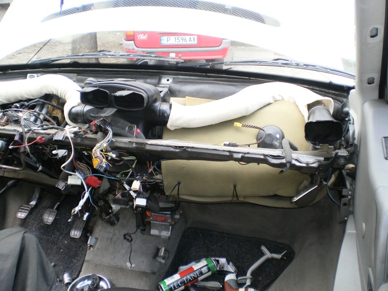 Колега да ти отговоря на въпросите.От всички духалки трябва да духа топло(значи дунапрена на клапите го няма)Таблото за съжаление се сваля цялото и зад него има греда тя също.Тънкия и наи неприятен момент е ако има пасажерски ербег,развива се отзад,свали дясната духалка до него да виждаш по добре.Според това което си направил като опити и аз си мисля,че пластмасовите спиралки в радиатора са станали на :кал"и е частично запушен.Моя е с климатроник но таблата са еднакви,дано съм бил полезен.Успех.