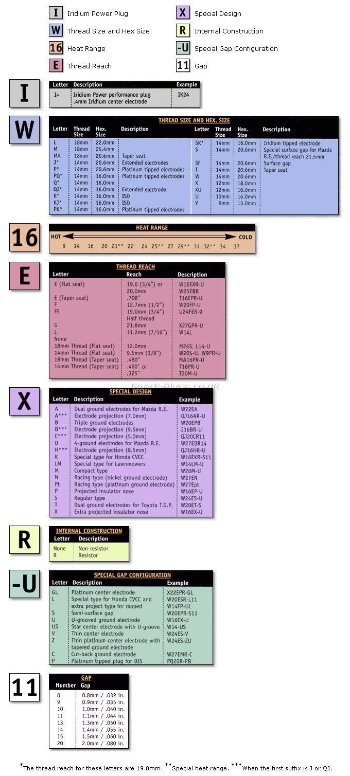 Ето ти таблицата с обясненията за значението на абревиатурите в DENSO конвенцията за именоване на моделите им свещи: