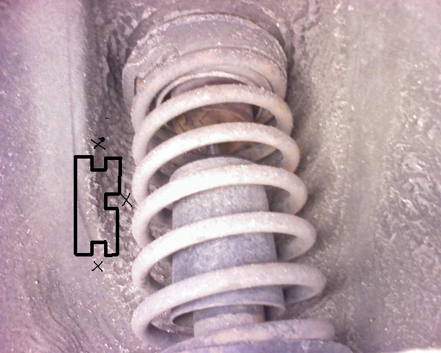 Не съм много добър с рисуването :mrgreen: но виж на снимката съм се опитал да ти покажа.На обозна4ените с X места ляга по една от намотките на пружината (общо 3 намотки),аз съм сложил по два тампона на пружина един срещу друг,на вси4ките 4етири пружини. Гледам 4е си от Монтана,отива6 на Руския пазар и си взимаш,мин.година беше по лев4е броиката. :да: